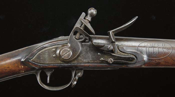 T. FRENCH 1809 FLINTLOCK MUSKET. SN NSN. Cal. 69. 44″ Barrel with 3 bands, is stamped “U.S.”, eagle head over “CT” in oval and “V”. Lock with straight spurred cock has unusual stampings with “Canton” under eagle, in front of cock, and “French” “1809” behind. Inspectors marks, “V” over “CW”, is on left side behind rear lock screw, with “WC” behind trigger guard tang. Initials “JMR” are punched into left buttstock. CONDITION: Fine. Metal parts are an even smooth brown patina. Stock has some oil rubbed in over the years, with hand worn patina at normal carrying points. Inspectors markings are clear. 4-41491 MGM286 (3,000-4,000)