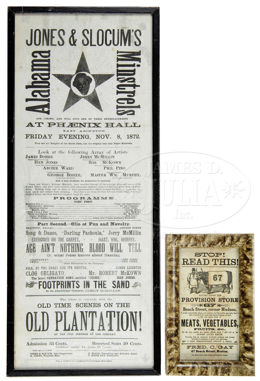 TWO FRAMED BROADSIDES. Third quarter 19th century, Massachusetts. Both framed, the first advertising “JONES & SLOCUM’s Alabama Minstrels”, dated November 8, 1872 proclaiming “They are not Knights of the Burnt Cork, but the original and only Negro Minstrels.” The second an advertisement for “Provision Store 67”, owned by “Fred. C. Gay, 67 Beach Street, Boston.” Declaring “I VERY RESPECTFULLY SOLICIT A TRIAL.” SIZE: Sight: 24″ x 9-1/4″, and 7-1/2″ x 4-1/4″. CONDITION: The first with repaired tear, left side facing. The second with light fold marks and discoloration. Both generally good. 9-27811 (800-1,200)