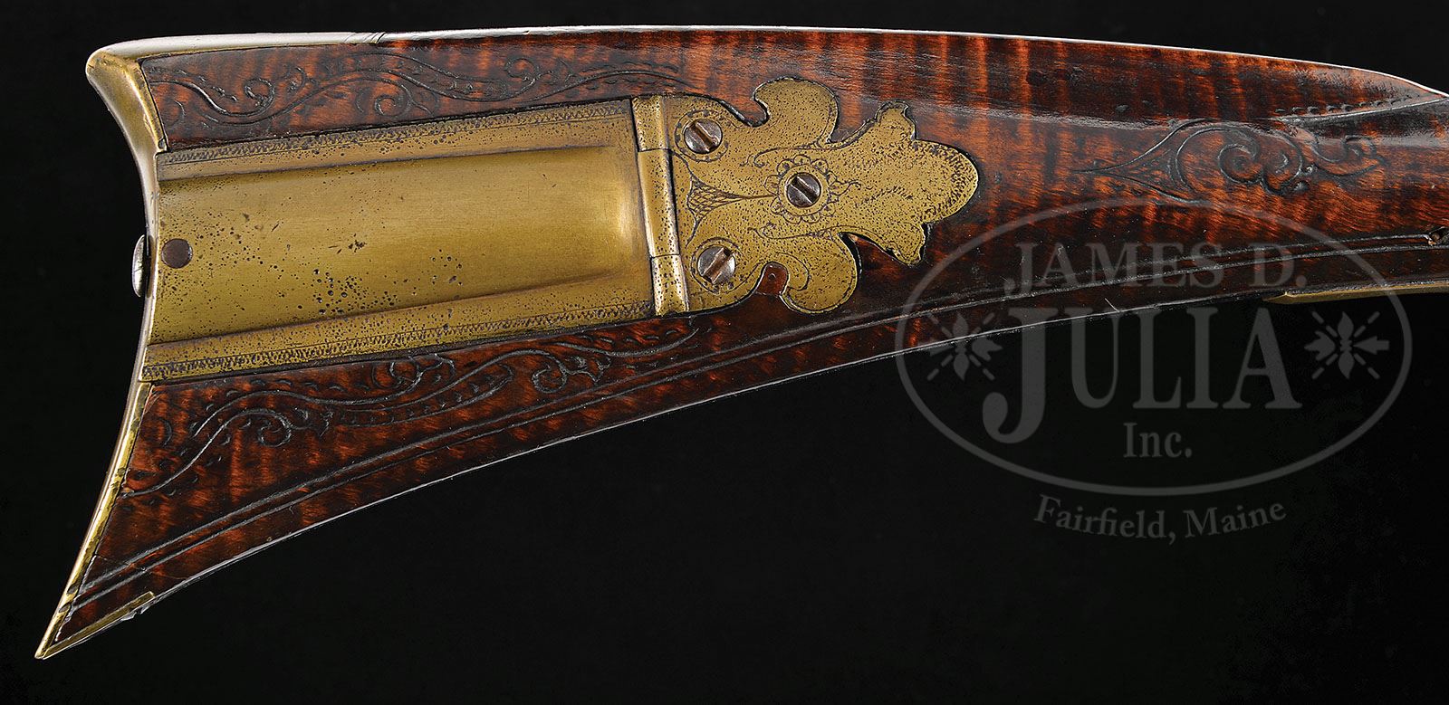 The lock in this gun is a replacement lock. ONE OF THE FINEST LEHIGH COUNTY RELIEF CARVED RIFLES MADE BY JACOB KUNZ. SN NSN. 42-3/4″ full oct 60 Cal. rifled unsigned bbl. Rifle is relief and incised carved forward of and behind the cheekpiece and the sideplates on the two piece patchbox are incised carved. Relief carving is present forward of the patchbox. Relief carving is profuse around the rear ramrod entrance pipe and is also nicely done around the bbl tang. Carving on this gun is the finest this cataloger has ever seen on a gun from the Lehigh Valley area. Two piece patchbox is heavy cast brass and the finial is engraved. Trigger guard is also cast brass and both the guard and the patchbox show original casting flaws. Heavy brass beveled arrow back sideplate is typical of the area and is not engraved. There is an engraved silver eight-pointed star on the cheek and the top point rolls over the comb. Stock is beautiful curly maple and the wrist is egg shaped, wider than high. Profile is classic Lehigh County. This cataloger is very familiar with this rifle. This rifle turned up at a barn sale in Snyder County in the 1960’s and was purchased by Dallas Ewing, a very close friend of this consignor. At the time it was located the forend wood, from the rear entrance pipe to the nosecap, was missing. The forend was painstakingly and professionally restored so perfectly that the officers of the Kentucky Rifle Association were unaware that it had been repaired when they inspected the rifle. Since that time another gun, not in nearly as good condition, with the same exact carving surfaced. The second gun was important, however, because it was signed “Jacob Kuntz” identifying the maker of both guns. This gun was selected to be used extensively in the advertising for the Kentucky Rifle Association’s 50th anniversary and was featured on their 50th anniversary banners. This cataloger remains of the opinion this rifle ranks among the best of the existing Lehigh County guns. Jacob Kuntz “Kunz” is a very important maker who was trained in Allentown, PA. Jacob moved to Philadelphia in 1810, and in 1812 married Barbara Newhard niece of the famous Allentown gunsmith Peter Newhard. in 1833 the Franklin Institute of Philadelphia awarded Jacon Kuntz a silver metal for his skill and ingenuity. Jacob died at the age of 95 years after becoming Philadelphia’s most sought after gunsmith by wealthy customers in England, Scotland, and America. Jacob was an excellent engraver and several examples of his work are on display in New York’s Metropolitan Museum of Art. This gun being offered in this auction originated from the same collection as one of the Kuntz rifles currently on display in the Metropolitan Museum’s collection. Item appeared in the President’s display, Kentucky Rifle Association. PROVENANCE: See President’s Display of Kentucky Rifle Association; see Brochure of Kentucky Rifle Association, 2011. Dallas Ewing, Dr. James Dorsey, Henry Bishop. Collection of Dr. Douglas Sirkin. CONDITION: Rifle is in wonderful condition throughout. Carving is crisp and beautifully done. . Casting flaws seen on the cast brass patchbox finial and cast brass trigger guard are original and correct. 4-50130 RG41 (50,000-70,000)