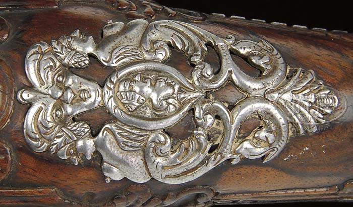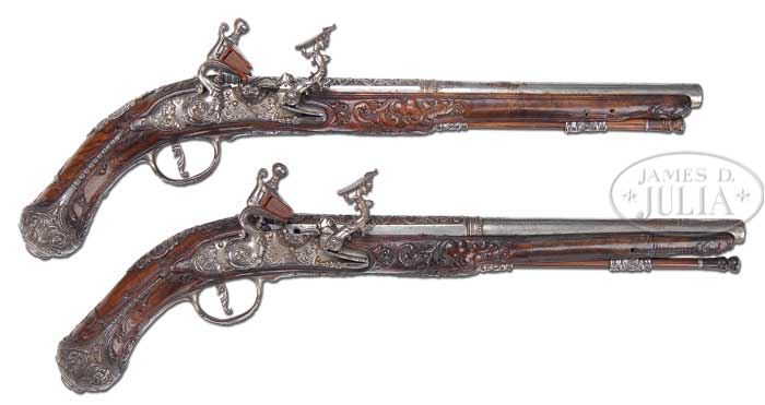 EXQUISITE PAIR OF HIGH RELIEF ENGRAVED EIGHTEENTH CENTURY ITALIAN SNAPHAUNCE PISTOLS SIGNED “IL NEGRONI” “A:BRENTO” AND DATED “1769”. SN NSN. Cal. 49. These truly exceptional pistols have 10-1/2″ segmented to round tapered barrels with wedding band transitions. Snaphaunce locks have spring loaded sliding pan covers. Full length stocks are of burl walnut. Furniture is of steel. Belt hooks are affixed to left side. Turned horn-tipped greenheart ramrods have steel worms at tails. The embellishment of wood and metal on these pistols almost defies description, due to its high quality and complexity. Relief engraving is of the highest order, perfectly detailed and polished, and is the work of the founder of the Negroni school of Tuscan metal workers. Interior of the lock of one pistol is signed “Il Negroni”, the other “A: Brento” and dated “1769” on sear housing. Heer in DER NEUE STOCKEL lists “Il Negroni” in Brento, Emilia, Italy from 1730 to 1770. There were a number of Negroni craftsmen in Emilia who worked as his contemporaries, or successors, including Angelo, Carlo, Giovanni, Pier Francesco, Pier Paolo, and Giovan Battista. Only the “master” and founder signed his work “Il Negroni”. Bright polished lock internals have file decoration to springs and sear housings. Barrels are engraved with high relief scrolled acanthus with stippled background, with be-wigged gentleman’s bust facing right at breech. The locks are absolutely exquisite, with arched plates with long tails. Sliding pan covers are embellished with full carved face of porcine mustachioed gentlemen. Bottoms of pans continue this theme, with another full carved face. Serpentine cocks have full, raised, carved, acanthus scroll framing mustachioed face on front edges, a tendril of scroll forms reinforces. Spurs terminate with small female head with long tresses. Cock retaining screws are carved with fat female face which matches pivot screws for frizzens, which have long sinuous arms, again, full relief engraved with sculpted scrolled flourishes, dragon’s heads, and extremely buxom female figures, supporting frizzen plates. Frizzen springs have nicely filed decorations, with turned finials. There are two relief figures on lockplates at either side of pans, facing each other, and holding flowers. Tails of locks have full relief busts of gentlemen facing forward. Deeply relief acanthus carved burl walnut stocks are iron mounted. These mounts have many piercings with the same acanthus themes as stocks, with added full relief engravings. Four trumpet blowing winged “angels” are on each bulbous butt cap, which also have geometric outline engraving and finials with full carved gentleman’s busts. Trigger guards with pierced acanthus finials have another large bust on bows. Triggers are relief scroll carved. Sideplates under belt hooks with relief filed acanthus finials, are pierced with scroll and dragon’s heads, framing pair of angels holding central relief portrait of what appears to be a buxom lady (?). Crest plates at tops of grips are also pierced with coiled dragons below a central portrait surmounted by grotesque mask, and flanked by large breasted “ladies” with pendulous bellies, and folded wings (fallen angels?). Beautifully filed and turned ramrod pipes continue the theme. CONDITION: Excellent, essentially “as found” with early high quality repairs and restoration to fore-stock of one pistol. Metal parts retain nearly all of their orig bright polish finish with some small areas of oxidation on bbls needing cleaning, some pitting around touch holes, and darkening on grip caps. There is some pinprick pitting on belt hooks. Stock of one gun is excellent, with very slight wear to carving. Two repaired cracks are in burl along fore-piece. About 4-1/2″ of fore-piece of the other pistol has been replaced, with closely matching burl with excellent replication of the carving of the other pistol. This newer piece has also subsequently cracked through mounting pin for thimble. This pistol also has a repaired crack running through front of lock mortise around bottom and up left side of bbl in front of sideplate. Interior web is reinforced with cloth. Thimbles of both guns are missing their retaining pins, and are only held in place by orig ramrods. An incredible pair of investment grade, museum quality, Italian pistols. Examples seldom come to market; especially in this astounding condition. 4-42076 MGM153 (10,000-15,000)