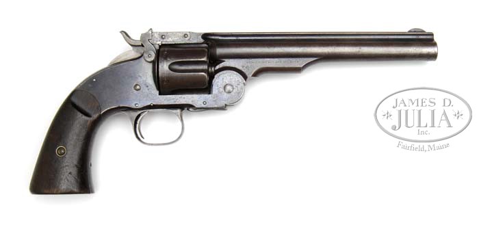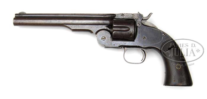 SMITH & WESSON 1ST MODEL SCHOFIELD SINGLE ACTION REVOLVER. SN 759. Cal. 45 S&W Schofield. Blue finish with 7″ keyhole shape bbl, half moon front sight and fixed rear sight in bbl latch. Left side of ejector housing has maker’s name & patent dates and the right side with Schofield’s patent. Mounted with smooth 2-pc walnut grips numbered to this revolver that have had the cartouche on left side obliterated. Butt strap has a small “US” on the toe. SN was observed on butt strap; rear face of cyl; inside top strap and under bbl latch. According to various publications only about 3,035 of these scarce revolvers were produced in 1875 with 3,000 being sold to the U.S. Government. They were in service for only a short period of time before being superceded by the 2nd Model Schofield, and shortly thereafter, were all sold as surplus to Schuyler, Hartley & Graham for resale on the civilian market. A large number of them had their bbls reduced in length and were resold to Wells Fargo given their checkered history and popularity on the American frontier, they are rarely ever found in orig bbl length such as this one with much orig finish. PROVENANCE: Fred B. McDonald Estate Collection. CONDITION: Very good to fine, all matching including grips. Bbl retains blue in the most sheltered areas being mostly a smooth medium brown patina. Cylinder is a smooth brown patina. Frame retains 60-70% thin orig blue with the front & back straps a dark brown patina. Grips show heavy wear with the obliterated cartouche. Mechanics are crisp, bright shiny bore with some scattered fine pitting. 4-41409 JR59 (3,000-5,000)