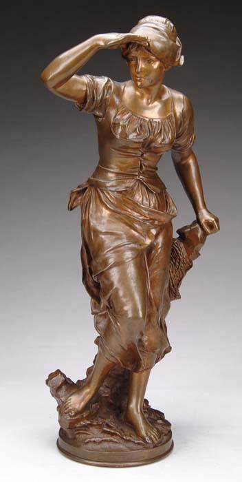 EUGENE MARIOTON (French, 1854-1925) ON THE LOOKOUT. Fine bronze sculpture of a standing woman with hand at forehead looking out to the distance. She holds a rolled net with her left hand and she wears a French country outfit and she stands on a round base. Signed “Eug. Marioton”. Also stamped “E. Colin & Cie, Paris”. Dark brown patina. SIZE: 25-1/4” h. CONDITION: Very good. 9-71623 (1,500-2,000)