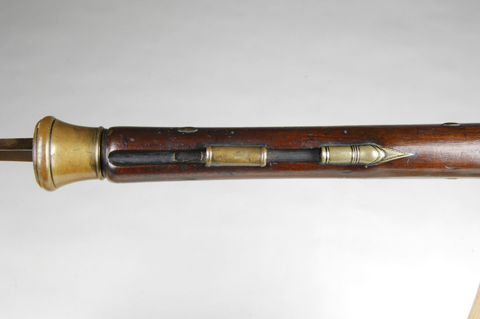 VERY FINE BALES BRASS CANNON BARREL BLUNDERBUSS WITH FOLDING SPRING BAYONET. SN NSN. Cal. .600 1.4″ at muzzle. This well made blunderbuss signed “Bales” (most probably John Bales, London ca. 1822), has 14″ octagon to round brass bbl with wedding band transition, extending to nicely flared and turned cannon muzzle, top of which is mounted with pivot and latch for 13″ triangular spring loaded steel bayonet, which folds back over top of bbl, and is retained by sliding latch mounted on bbl tang. There are some sprigs of acanthus engraving on octagonal part of bbl, which is also stamped with Birmingham proofs. Nicely filed high quality lock has semi-waterproof pan with bridled friction frizzen. Roller is on frizzen spring which has nicely filed teardrop finial with tit. Cleanly chamfered and line border engraved lockplate with rebated tail is mounted with flat-faced chamfered serpentine cock. A sliding safety bolt is mounted at rear of cock. Lockplate has some feather and stand-of-arms engraving behind cock. “Bales” is in front of cock. Relatively plain European walnut stock is mounted to bbl with two side nails, and is brass mounted. Top tang of buttplate and trigger guard bow are engraved with stand-of-arms. Trigger guard has stylized pineapple finial. Grip is checkered with 20 LPI square checkering with mullered borders. Ramrod pipes are of brass. Tail pipe is nicely filed. Ramrod is missing. CONDITION: Fine. Bbl is a gold to red brown patina. Bayonet with some surface oxidation, is mostly gray brown. Lock is brown with some pinprick pitting, but with a considerable amount of what appears to be orig bright polish, showing through a layer of grime. Stock retains most of its orig finish. All edges are sharp, with numerous marks and dings. Brass furniture is nicely toned to a dark gold. Front ramrod pipe appears to be a very old replacement. Lock and frizzen are crisp. Spring bayonet is intact, and also in fine working order. A very fine, essentially untouched, example. 4-42670 MGM106 (2,000-4,000)