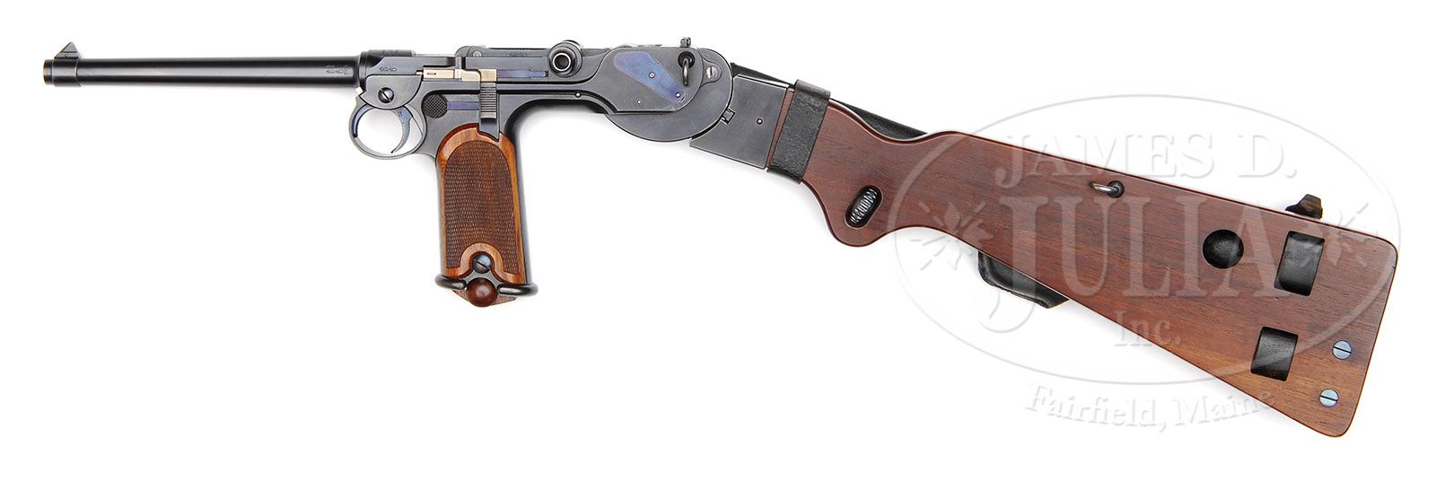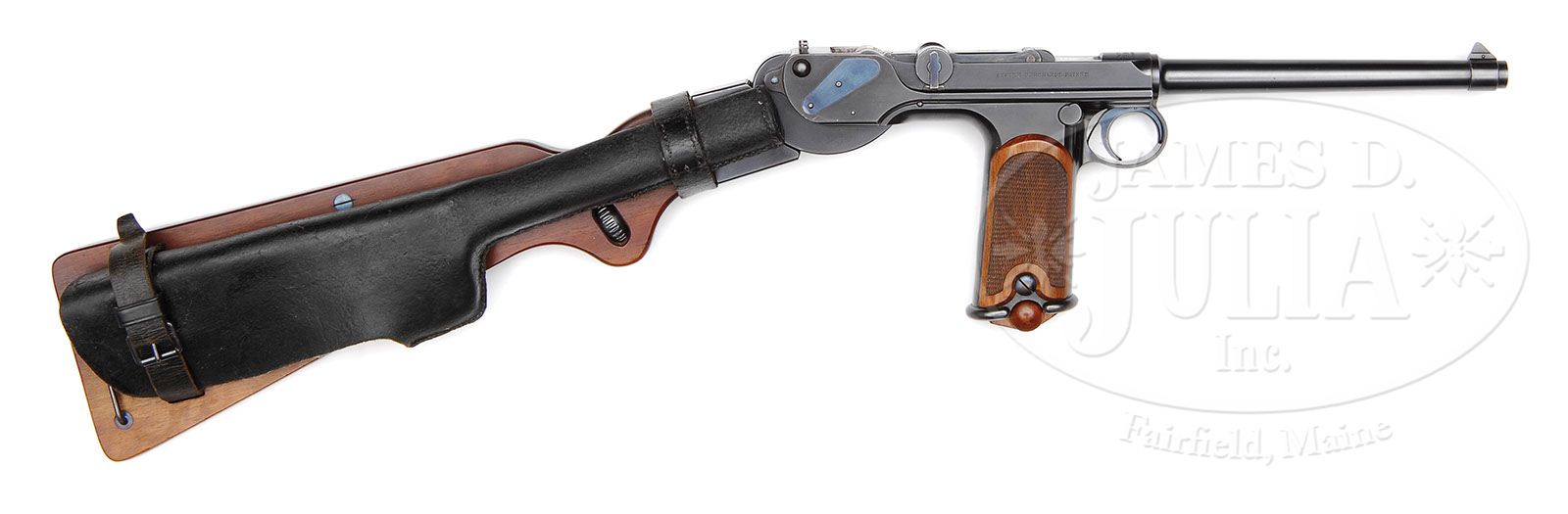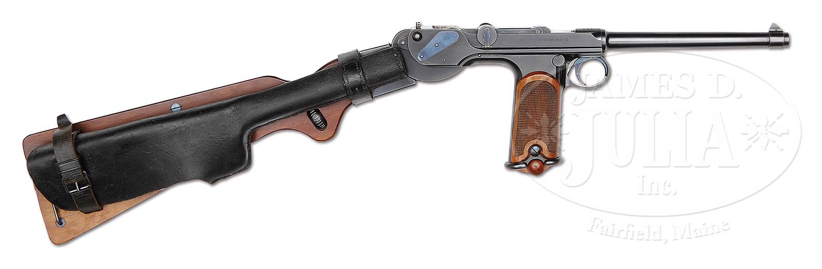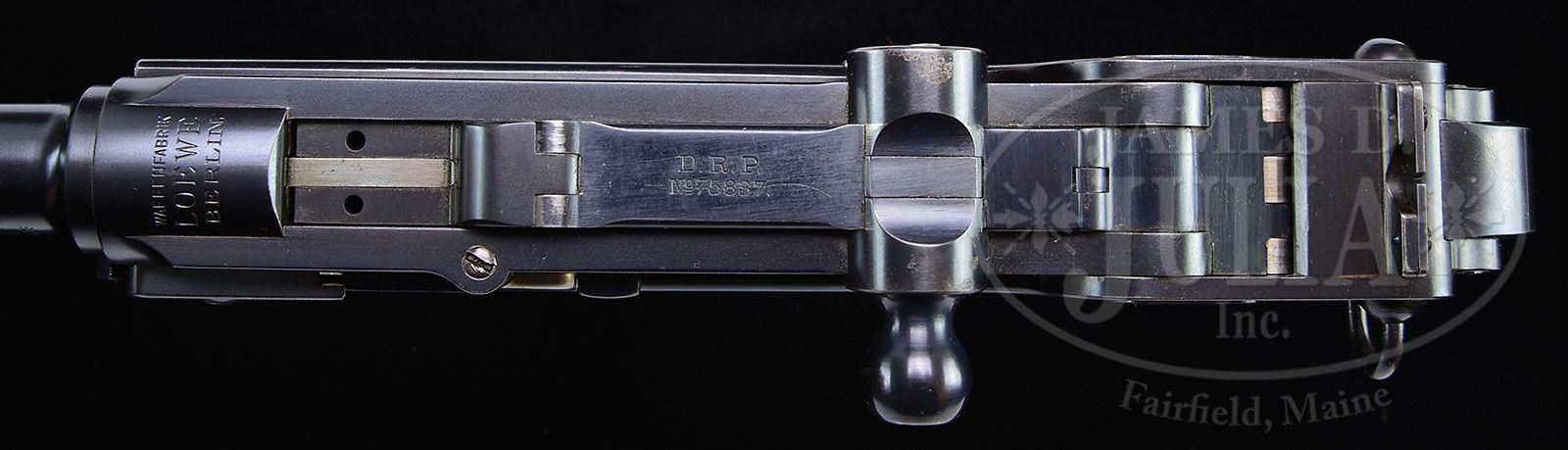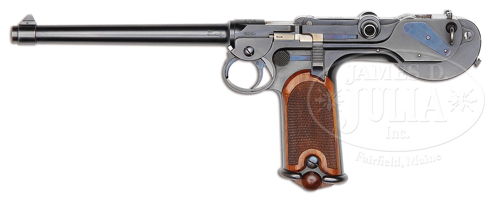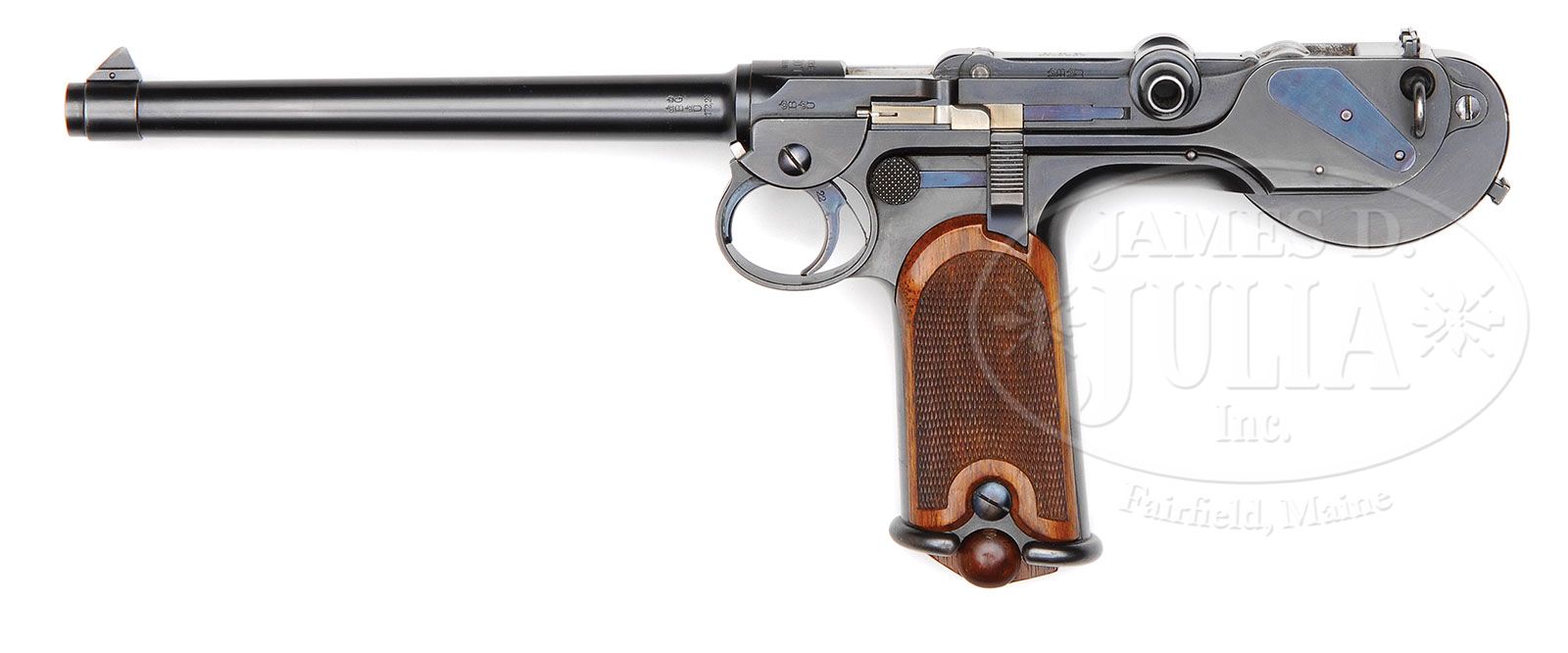 EXCEEDINGLY RARE CASED MODEL 1893 BORCHARDT PISTOL BY LOEWE. SN 22. Cal. 7.65mm Borchardt. Spectacular orig early Borchardt with 7-1/2″ tapered rnd bbl, pinned triangular shaped front sight and v-notch rear sight at the top rear of the frame. It is mounted with 2-pc checkered walnut grips matching numbered to this pistol. The receiver ring is marked “WAFFENFABRIK / LOEWE / BERLIN” and the toggle link is marked with the German patent no. Left side of bbl has “BUG” proofs and “BU” proofs on the left forward side of receiver. Right side of receiver is marked “SYSTEM BORCHARDT.PATENT.” Rear of the spring housing has a stock attaching lug. Accompanied by an orig black leather-covered, green felt-lined trunk case with nickeled brass furniture and stacked leather handle. Bottom is compartmented for the pistol, accompanying the matching numbered walnut stock that has attached orig leather holster, four matching numbered orig wood-based magazines; orig, matching numbered cheekpiece and orig dummy wooden mag/cleaning tool; orig walnut-handle with steel ferrule for the enclosed orig brass cleaning rod and 2 orig screwdriver bits. Also included is an orig Borchardt tinned steel oiler in its orig black Moroccan leather case, 2 small blued steel punches, 2 slave pins and an orig nickeled stripper clip. Also accompanying is a bristle bore brush not for this equipment. The only item that appears to be missing is the leather sling, however, the blued steel keeper stud for the sling is included in the triangular shaped covered compartment. The Borchardt pistol was the design basis for the more famous and durable Luger pistol. There were only about 1,104 of these rare pistols produced before being discontinued. This design was originated and patented by Hugo Borchardt. Mr. Borchardt was a talented designer who became a U.S. citizen in 1875. Prior to that, he had been foreman at the Singer Sewing Machine Co. and went to work for Winchester in 1873 where he designed and patented the machine to cut lubricating grooves in bullets. He left Winchester in 1876 to become Superintendent at the Sharps Rifle Co. where he designed the Sharps-Borchardt single-shot rifle which he licensed to Sharps. When Sharps went out of business in 1880 Mr. Borchardt returned to Europe where he worked at different firearms companies, filing 29 German patents in the firearms field and 10 other unrelated patents. With the successful production of his Model 1893, Mr. Borchardt attempted to garner military contracts but due to the fragile nature of this pistol and the awkward handling, no such contracts were forthcoming. In 1897, the firm of DWM had requested Mr. Borchardt to redesign and improve his pistol, which he stubbornly refused. DWM then assigned this project to a young designer, Georg Luger, who in 1898, was granted his first patent for improving the Borchardt pistol. This created a rift between Borchardt and Luger which never healed. Mr. Borchardt, until his death in 1924, claimed that Luger’s designs were not original but had, in fact, been stolen from him. Regardless of the strife between Borchardt and Luger, the orig Borchardt pistols remain today as the truly first commercially successful semi-auto pistol and are in great rarity. PROVENANCE: Consignor provenance indicates pistol was a presentation from Kaiser Wilhelm II to German Attache Adm. Charles Vreeland in the early 1900s during a goodwill cruise of the “Great White Fleet” to which Vreeland was attached. The gun was handed down through his Family. Gun also resided, on loan, in the NRA National Firearms Museum for 5 years until 2008. CONDITION: Extremely fine plus, all matching. Overall retains about 99% crisp, orig factory blue with only faint muzzle edge wear. Trigger and springs along with screw heads retain about all of their orig fire blue and the sear & extractor about all of their bright straw colors. Grips are crisp with no discernible flaws retaining about all of their crisp orig varnish. Stock is equally new with only some minor surface scratches. Cheekpiece and dummy magazine are also crisp and new as are the 4 orig magazines. All other accessories are virtually new. Case is sound with nicks & scratches in the surface. Interior is intact with solid partitions showing light fading and very light soil. This is a truly extraordinary set. 4-47365 JR236 (50,000-75,000)
