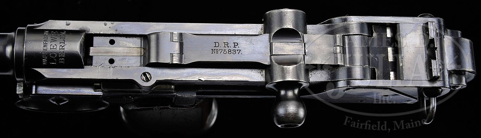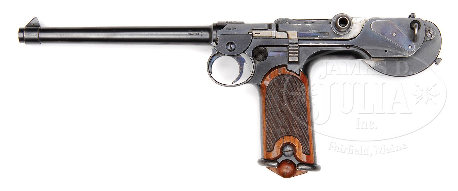 RARE LOWE MODEL 1893 BORCHARDT SEMI-AUTO PISTOL. SN 485. Cal 7.65mm Borchardt. Blue finish with 7-1/2″ tapered rnd bbl. Pinned front sight with fixed V-notch rear sight atop the spring housing. It has standard Lowe markings over the chamber with German patent markings on the toggle link and “BUG” proofs on the bbl with “BU” proofs on the side of the receiver. Right side of the receiver is marked “SYSTEM BORCHARDT PATENT”. It is mounted with checkered 2-pc walnut grips, matching numbered to this pistol. Accompanied by one orig wood base, matching numbered magazine. There were 1104 of these rare pistols produced by Lowe in the period 1893-1895 and are considered to be the first commercially successful semi-auto pistol. In 1895 the manufacturer was undertaken by DWM who produced nearly 2000 more before the design was superseded by the venerable and ultimately successful Luger pistol. Mr. Borchardt had tried for military contracts but given the somewhat awkward handling and fragile design of his pistol, he was unsuccessful and, for the same reasons, his pistol was not readily accepted with the buying public. In 1895 Hugo Borchardt was requested to consider improving his design, as suggested by Georg Luger through DWM. He became incensed and refused. DWM then proceeded to sponsor Mr. Luger and the rest is history. Borchardt and Luger apparently remained mortal enemies until Mr. Borchardt’s death, claiming that Luger had stolen his design. CONDITION: Very fine to extremely fine. Overall retains 96-97% crisp orig blue with light sharp edge wear and some light thinning on the sides of the receiver where it slides in the frame. Front and back straps have some tiny pin prick rust spotting and bottom edges are turning a little plum. Trigger and exposed springs retain lightly faded fire blue. Straw colors are mostly faded. Magazine is very fine. Left grip has a longitudinal crack otherwise grips are sound and retain most of their orig varnish. Mechanics are fine, strong bore, lightly pitted in the grooves. 4-48248 JR374 (10,000-15,000)