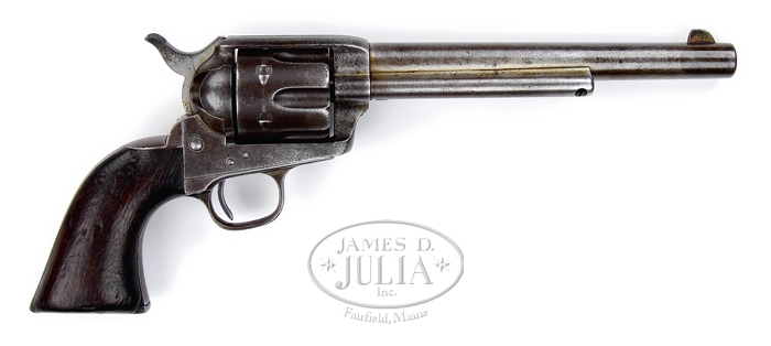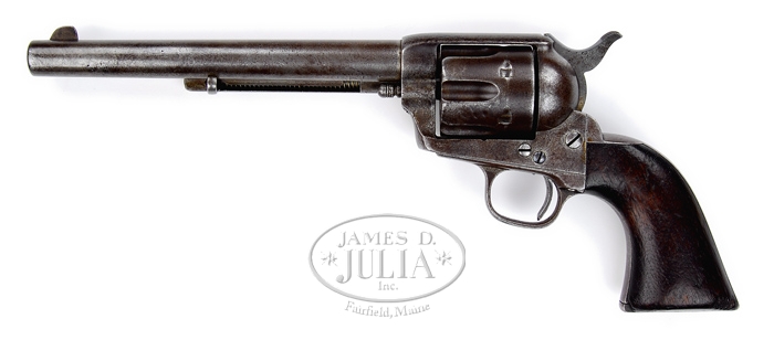 COLT SINGLE ACTION ARMY REVOLVER. SN 67991. Cal. 45 Colt. Early civilian model with 7-1/2″ bbl, slightly altered front sight with 1-line block letter address. It has 3-line patent dates and caliber stamped on left front web of trigger guard and is fitted with 1-pc walnut grip. It has third type ejection rod housing with half moon ejector rod head which may be an old replacement. Base pin is orig with dimpled ends. This revolver is rather scarce having been made in a period when most of Colt’s single action production was directed toward filling military contracts. CONDITION: Good to very good. No orig finish remains being a fairly even medium to dark blue/brown patina with scattered fine pitting especially in bottom gullets of frame. Hammer is a modern replacement as are two or three of screws. Grip shows heavy wear with chipped toes and a series of notches on left heel and retains a dark hand worn patina. Hammer will not hold in safety notch, otherwise mechanics are fine, strong dark bore. Would make an outstanding cowboy action shooter. 4-59723 JR204 (2,000-3,500)