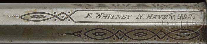 RARE CASED ENGRAVED 2ND MODEL 2ND TYPE WHITNEY NAVY PERCUSSION REVOLVER. SN 7960M. Cal. 36. scarce engraved Whitney Navy with 7-9/16″ oct bbl, brass pin front sight and hand engraved “E. WHITNEY N. HAVEN, USA.” address. Revolver has 6-shot cylinder with six safety notches in rear edge, brass trigger guard and 3-pc rammer with Colt style bayonet latch. Revolver is mounted with very old replacement, smooth ivory 2-pc grips. Frame is engraved in New York style with about 60% coverage foliate arabesque patterns with fine punch dot background. Sides of bbl are matching engraved with geometric patterns on top side flats and around the address. Sides & top edge of hammer are also engraved and the top of back strap is engraved in a Nimschke style fan. Near the top of back strap, at the heel, on the butt strap & trigger guard are engraved with matching foliate arabesque patterns. Cylinder is engraved to match around the center with engraving patterns on lands between the nipple recesses on rear edge. Accompanied by a modern mahogany casing with a small brass rectangular plate in top inscribed “U.S. NAVY”. Interior is purple velvet lined and compartmented in bottom for revolver, a large Navy/Army single sided flask w/Trophy of Arms decoration and crossed pistols & rifles above; a Whitney 2-cavity bullet & ball mold with sprue cutter; an L-shaped nipple wrench; a small English pewter oil bottle; a tin of Goldmark’s caps and a functioning key. PROVENANCE: Fred B. McDonald Estate Collection. CONDITION: Fair to good. No orig finish remains being an overall heavily cleaned gray metal patina. Tip of the cylinder spindle part of the rammer is damaged. Grips show heavy wear with heavy rust stains on inside and evidence of added glue filler around the edges, and retain a very dark gold patina with some age lines. Mechanics are a little loose but functional, very worn dark bore. Case is sound with light handling & storage nicks & scratches and retains most of its custom finish. Interior is lightly soiled with bright fabric. Flask has a couple of dents on back side and overall retains about 30% orig finish. Mold retains a dark brown patina; other implements are fine. 4-41383 JR61 (2,000-3,000)