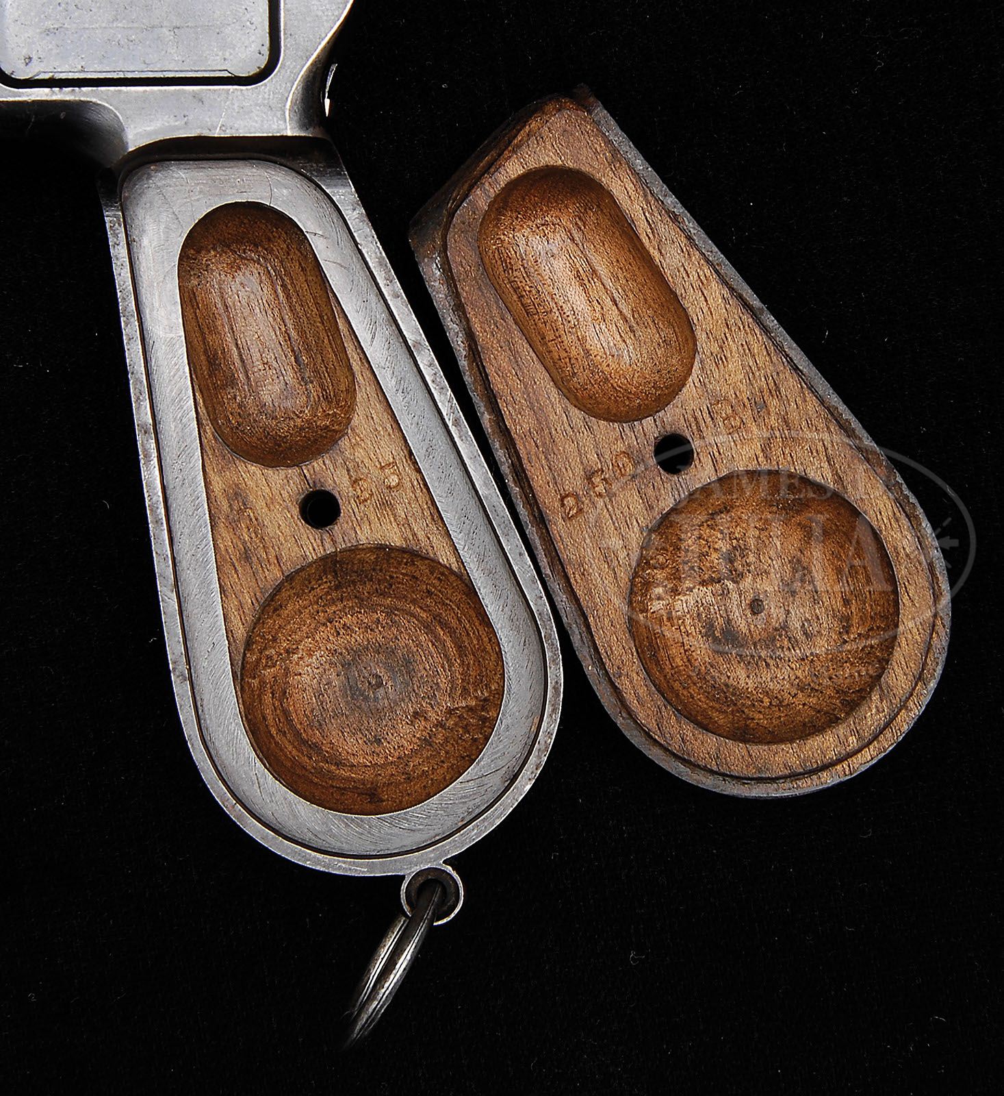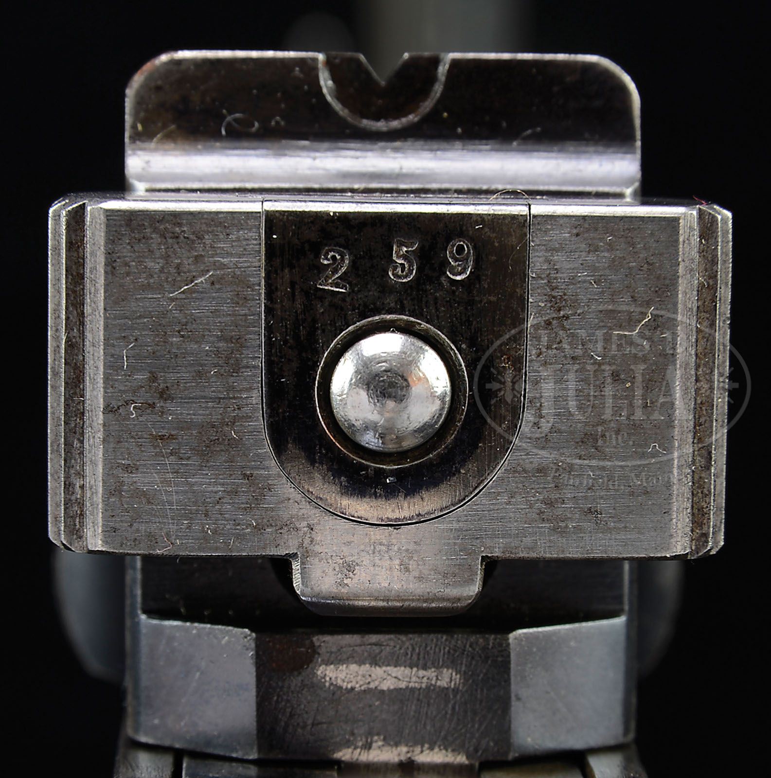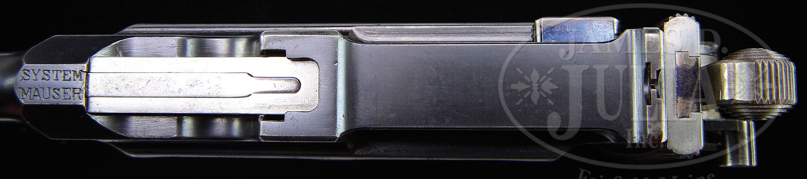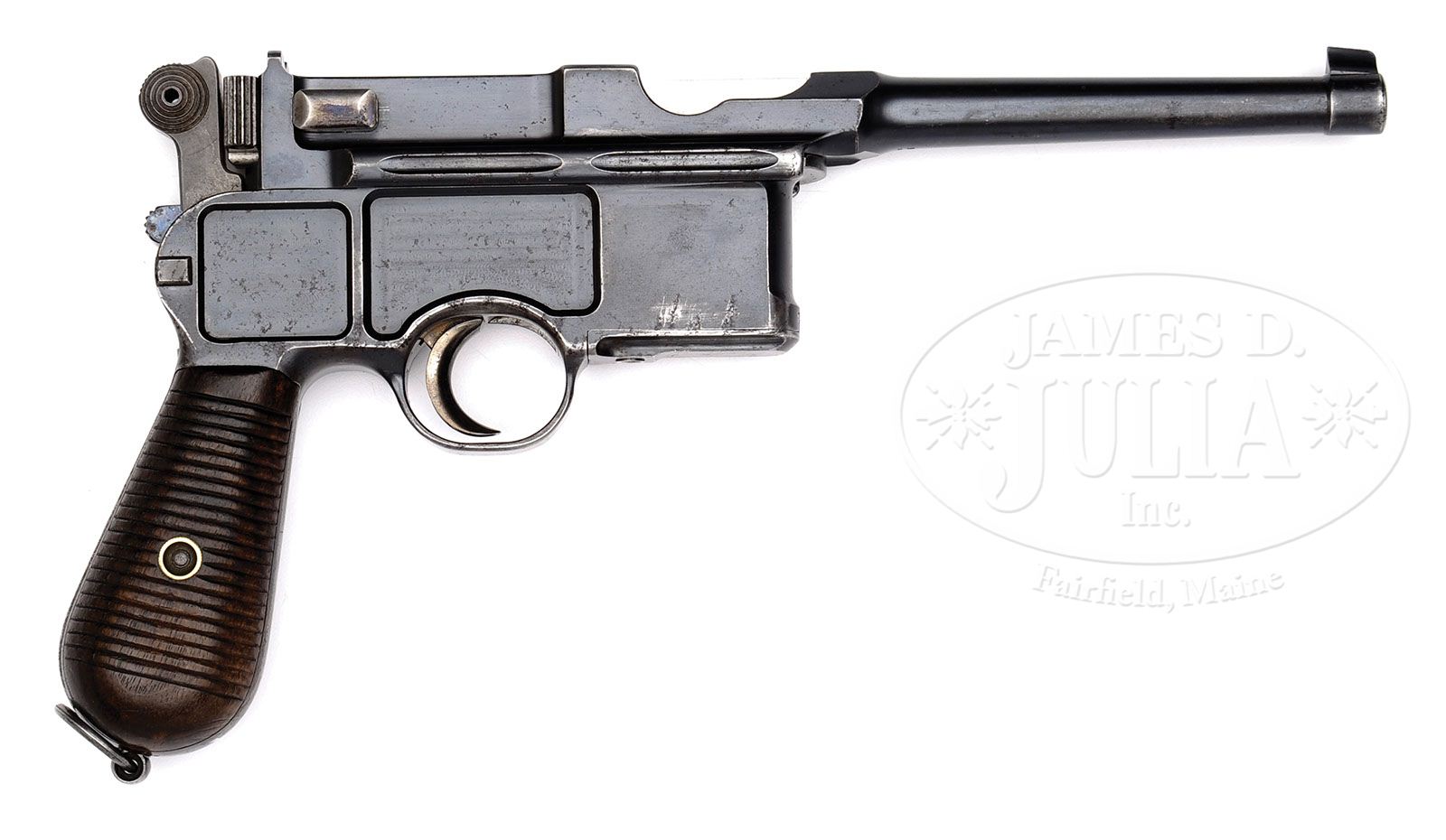 RARE AND DESIRABLE C96 “SYSTEM MAUSER” SIX SHOT. SN 259. Cal. 7.63 mm. 4.75” bbl, tapered chamber and fixed rear sight. Thin backstrap never made for shoulder stock. Early large crown U proofing on left side of chamber. Detailed disassembly shows all small parts with matching SN. Scarce grips with each panel having two hollows and marked with “B” in addition to SN. PROVENANCE: Ralph Merrill Collection CONDITION: 90-95% orig finish with slight thinning on each side of the bbl and wear to the right side of the magazine housing as pictured. Scratches on the lower floorplate and toning on the front and backstrap. Good bore with shallow rifling and superficial corrosion as common to many early pistols. Mauser made very few System Mauser marked guns and even fewer 6-shots. This all orig pistol, one of just 3-4 that have been offered for sale in the past 20 years, would be an outstanding addition to any serious C96 collection. (Antique). 4-47194 LMA1 (20,000-40,000)
