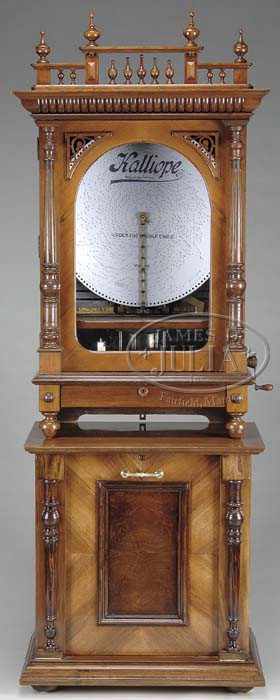 25-1/2″ KALLIOPE GLASS FRONT UPRIGHT WITH 10 DISCS. Nice tall walnut case with diamond matched veneers, turned columns and heavy moldings, filigree corners framing an arched window in the door. Tilt-out disc storage in base with 10 discs. Coin-operated, plays by a five pfennig coin. Fancy pediment with lots of finials. Plays 12 orchestra bells along with full music box. Music box sits on top of base to make a very tall and handsome instrument. SIZE: 32-1/2″ w x 90″ h x 20-1/2″ d. CONDITION: Original mechanism, plays beautifully. Case is refinished with new faithfully reproduced pediment. All keys are present. 1-10976 (8,500-9,500) Auction: Advertising, Toy & Doll - Spring 2011 Please Note: All prices include the hammer price plus the buyer’s premium, which is paid by the buyer as part of the purchase price. The prices noted here after the auction are considered unofficial and do not become official until after the 46th day. |
