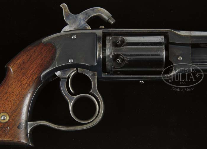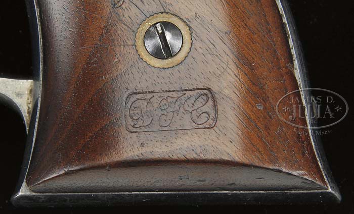 SCARCE MARTIALLY MARKED SAVAGE NAVY PERCUSSION REVOLVER. SN 13853. Cal. 36. Blue finish with 7-1/8″ oct bbl, brass pin front sight and fixed rear sight in top strap. It has 6-shot cyl with square rear shoulder and large heart-shaped trigger guard. Inside the trigger guard is a ring trigger which cocks the hammer & rotates the cylinder, with a conventional trigger above which drops the hammer. Mounted with smooth 2-pc walnut grips numbered to this revolver with a crisp “DFC” (David F. Clark) cartouche on left side and a crisp “BH” (Benjamin Hannis) cartouche on right side and small inspector initials on various parts. Approx. 12,000 of these pistols were purchased by both the Army & Navy in the period of the early 1860s with most seeing hard service throughout the Civil War. These revolvers were very well made and nicely finished and are rarely found today with high orig finish. CONDITION: Extremely fine, all matching including bbl, cyl & grips. Bbl retains 80-85% strong, glossy, orig factory blue with some flaking, not wear on right side and right bottom flat with flaked areas a light patina. Frame retains 90-92% strong, glossy, orig blue with some light flaking on top strap and a few other small flaked spots. Back strap is thinning blue with a blue/gray area in the center. Cyl retains about 95% glossy orig blue with one small spot of rust and some flaking around nipple recesses. Hammer retains virtually all of its bright orig case colors with the trigger guard & ring trigger having bright case colors on right side, fading on left side. Grips are sound with a few minor nicks & scratches and retain most of their strong orig factory varnish. Mechanics are crisp, strong bright bore with scattered pitting. 4-42014 (12,500-17,500)