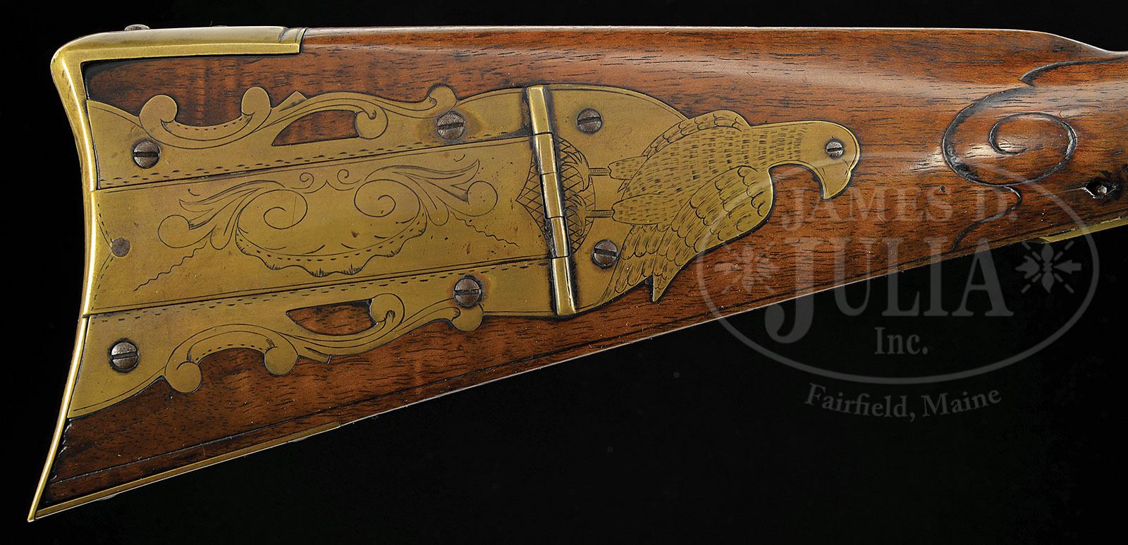 ATTRACTIVE JOHN LECKNER RELIEF CARVED YORK COUNTY FLINTLOCK KENTUCKY RIFLE. SN NSN. 42″ full oct 50 Cal. smooth rifle with unmarked bbl. Four piece engraved patchbox the finial of which is a nicely engraved bird standing on the patchbox hinge. Rifle has nice relief C scroll and rococo carving behind the cheekpiece and running under the cheekpiece and around the comb to the wrist area. Rifle is relief carved behind the bbl tang and is incised carved on each side of the ramrod entrance ferrule. Lock is marked “R. Ashmore Warranted” and appears to be original flint. Brass toeplate has one piercing and is held in place by two screws. Beveled brass sideplate is not engraved and has a third screw securing the rear of the sideplate. Honey colored stock has only traces of curl in the butt and the ramrod is held in place by four ramrod pipes. Patchbox on this gun is very similar to the John Leckner gun Number 140 in Kindig’s Thoughts on the Kentucky Rifle in its Golden Age. This gun was probably manufactured in the early 19th century. PROVENANCE: See Thoughts on the Kentucky Rifle in Its Golden Age, 1960, by Kindig, p. 333. Collection of Dr. Douglas Sirkin. CONDITION: Minor slivers repaired on sides of forend (hard to see). Otherwise the rifle seems to be original throughout. 4-50132 RG54 (10,000-20,000)