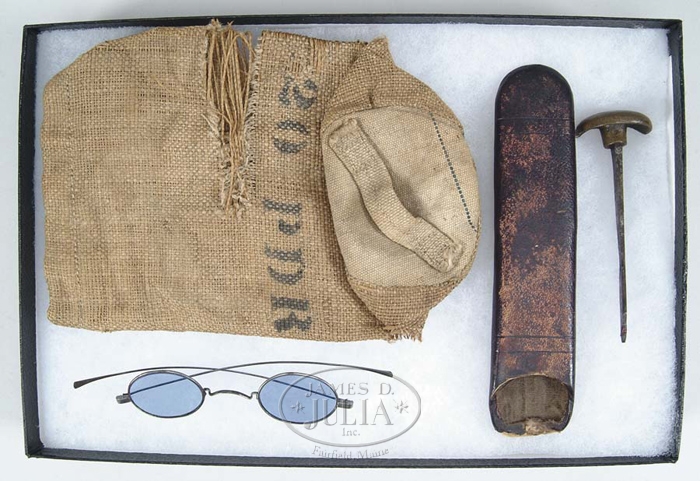 LOT OF THREE ARTILLERY RELATED ITEMS. Non-excavated. 1) 20-pounder sponge cover for the sponge rammer; 2) a Bormann fuse punch; 3) a pair of spectacles with light blue tint w/case. CONDITION: Large tear to sponge cover, otherwise all in very fine condition. 4-56283-9 JM233 (200-400)
