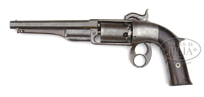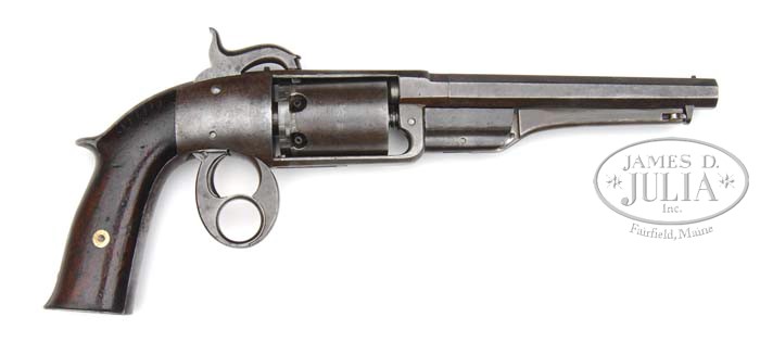 RARE SAVAGE & NORTH FIGURE-8 2ND MODEL PERCUSSION REVOLVER. SN 2. Cal. 36. Usual configuration with 6-7/8″ oct bbl, brass pin front sight and top strap marked “E. SAVAGE.MIDDLETOWN / NORTH.PATENTED.JUN—“. No other markings are visible anywhere on the pistol except the SN. It has unfluted 6-shot cyl with square rear shoulder and is mounted with 2-pc smooth walnut grips numbered to this revolver. Right grip has six notches on top edge. Bottom of bbl lug & left side of front frame have a welded repair which has cracked again. Rammer housing is also cracked on the top right edge. Bbl & rammer handle appear to have been reduced in length. According to Flayderman’s Guide to Antique American Firearms only about 100 of these rare revolvers were produced in the period 1856-1859. CONDITION: Fair to good, all matching. No orig finish remains being an overall gray/brown patina. Rammer handle has been artificially aged. Grips have a compression fracture inside the left side, not visible to the outside, otherwise grips are sound showing heavy wear and retain 40-50% orig varnish. Mechanics are fine, strong bore with sharp rifling and moderate pitting. 4-42015 (7,500-10,500)