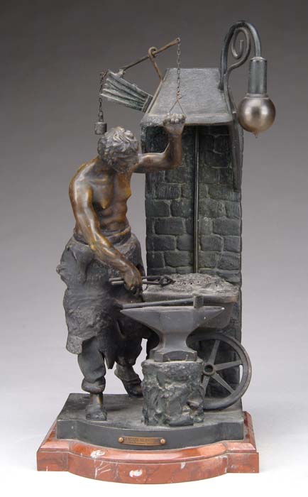 BRONZE FIGURAL LIGHT AFTER ROUSSEAU. The figural scene shows a shirtless blacksmith at his bellows with a hammer and anvil on stump. His hand is moving a bellows which fans the fire below. A light hangs from the top hood. All mounted on a shaped marble base. There is a plaque on the edge “La Veillee Du Forgeron Par Rousseau (Sculptr)”. Bronze is electrified with a cord and switch. Light bulb is present but does not work. SIZE: 18-1/2” h x 9” w x 7” d. CONDITION: Very good, one side of marble base is missing outer trim edge. 9-71618 (1,500-2,500)