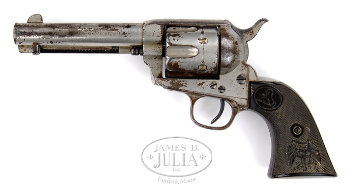 COLT FRONTIER SIX SHOOTER SINGLE ACTION ARMY REVOLVER. SN 110152. Cal. 44 WCF (44-40). Nickel finish with scarce 4-3/4″ bbl, 2-line address with “COLT FRONTIER SIX SHOOTER” etched panel on left side. There is a tiny “44” on bottom of bbl. Left side of frame has 3-line patent dates and left web of trigger guard is marked “44 CF”. It has fine rampant Colt & eagle hard rubber grips. Would make a fine cowboy action shooter to go with a Winchester Model 73 or 92. CONDITION: Very good. Overall retains 60-70% milky nickel with loss areas a medium patina. Grips show moderate wear with right side turned chocolate. Will not hold in safety notch or half cock, otherwise mechanics are fine, strong bright bore with scattered fine pitting. 4-59720 JR196 (3,000-5,000)