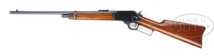 *SCARCE MARLIN MODEL 94 BABY SADDLE RING CARBINE. SN 306218. Cal. 38-40. Scarce Baby Carbine with 20″ rnd bbl, half magazine, barleycorn front sight and 900 yard carbine ladder rear sight. Left side of receiver has a staple & ring. Mounted with very nicely figured, straight grain, uncheckered American walnut with straight stock & carbine buttplate. Only a few of these Baby Carbines were produced with most seeing hard service wherever they were in use and rarely are found today with high condition. This is one of the finest ever examined by this cataloger. Consignor states that this is the only 1894 baby carbine produced. CONDITION: Very fine to extremely fine. Bbl & magazine tube retain about 98% strong orig factory blue with faint muzzle edge wear & one small scratch on right side of bbl. Receiver retains 96-97% strong orig factory blue with only sharp edge wear and one tiny cleaned spot on left side. Lever & hammer retain most of their orig case colors, lightly to moderately faded. Forearm has a hairline in the tip, otherwise wood is sound with usual handling & use marks with a gouge and a series of small scratches on buttstock. Forearm has two or three small gouges and retains about all of its strong orig varnish. Mechanics are crisp, brilliant shiny bore. 4-39061 (7,500-12,500)