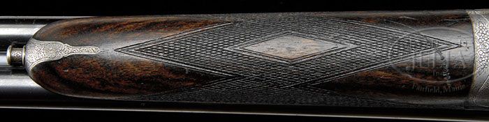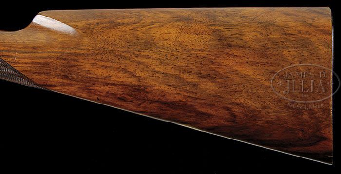 Correction: Lot 2362, 2365 and 2368 were owned by Winston Franklin Churchill Guest, not lots 1333, 1334 and 1335 as stated in the catalog. *WINSTON GUEST’S VERY FINE 20 GAUGE PURDEY BEST SIDELOCK EJECTOR GAME GUN WITH EXTRA BARRELS AND MAKER’S CASE. SN 25790. This lot was owned by the internationally known sportsman and Ernest Hemingway confidant, Winston Franklin Churchill Guest. Winston Guest and his celebrity wife “CZ” Cochrane Guest were married at Hemingway’s house “Finca Vigia” in Havana in 1947 with Hemingway as best man. Guest and the American government outfitted Hemingway’s sportfisher “Pilar” during the much chronicled hunt for German U-boats in the Gulf Stream during WWII and was one of the crew. The Hemingway double rifle aboard “Pilar” which Julia’s sold in the March 2011 auction for $339,250 was a gift from “Wolfie” as Hemingway called him. The two hunted extensively together in the Americas and made several trips to Africa. English born Guest was a ten goal polo player who led Yale’s polo team to the intercollegiate championship. He became an American citizen at age 21 in order to play on the USA international polo team. He won the International Polo Cup for America against England in 1930. 1936, and 1939, versus Argentina in 1928 and 1932, and against Mexico in 1941. His grandmother was Lady Cornelia Spencer – Churchill, daughter of John Churchill, 7th Duke of Marlborough. He was Godson, second cousin and namesake of British Prime Minister Winston Churchill. Cal.20 ga. 2-3/4″ Chambers. Factory records indicate completed in 1941 for Mr. Robert Winthrop with 27″ and 28″ Chopper lump bbls engraved with Purdey Audley House address on narrow game ribs. 28″ Bbls also have Whitworth steel information. Bbl flats have London nitro proofs for 2-3/4″ chambers. In 1954 Purdeys lengthened the chambers of the 27″ bbls and made chokes good cylinder left good 1/4 and re-proofed them. They also added a new set of bbls (length not specified) with 2-3/4 chambers choked right 1/4 left 3/4 choke. Bottoms of bbls are stamped with “Choke”, SNs, and bbl makers initials “G.W” (George Wood). Tube nos. 63841 and 63842 are on loop of 27″ bbls, and 65987 and 65988 are on 28″ bbls. Scaled down Beesley self-opening action features automatic safety (SAFE inlaid in gold), bushed strikers, raised rib tumbler end cocking indicators, and double triggers. Action is engraved with well cut Purdey house style rose bouquet and scroll with “J. Purdey & Sons” on lockplates, and bottom of action, which is also engraved “London England”. Lightly streaked European walnut straight grip buttstock measures 16-1/2″ over checkered wood butt, and features Purdey style drop points and point pattern checkering. Gold oval is on toe line, engraved with initials “A.G” (Alexander Guest, son of Winston and “CZ” Guest, born 1954). Splinter ejector forend has Anson release. Iron is stamped with actioners initial “H” (Fred Hughes). 27″ Bbls: Bore diameter: left -.615, right -.616. Bore restrictions: left -.013, right -.002. Wall thickness: left -.035, right -.037. Weight: 6 lbs. 7.5 oz. 28″ Bbls: Bore diameter: left -.615, right -.615. Bore restrictions: left -.025, right -.012. Wall thickness: left -.033, right -.032. Drop at heel: 2-1/4″, drop at comb: 1-9/16″. Weight: 6 lbs. 8.5 oz. LOP 16-1/2″. Brown oak and leather case with brass corners and central medallion on lid is lined in purple cloth with gold embossed black leather Purdey label, and space for both bbl sets. Accessories include pair of A & F marked snap caps, square oil bottle, and bone striker case. PROVENANCE: One of three Purdey guns obtained by the consignor directly from the family of Winston Guest. CONDITION: Very fine. 27″ Bbls retain what appears to be their orig blue, but are most probably re-blued at time of re-proof. 28″ Bbls retain most of their orig blue. Bbls are silvering at muzzles and thinning at points of normal wear a very few minor nicks from usage. Action retains 20 – 30% orig case color. Lockplates retain most of their color, it being quite strong on left lockplate. Trigger guard and top lever retain most of their orig blue. Trigger guard is silvered considerably at grip, and top lever at thumbpiece. Replacement buttstock retains nearly all of its orig rubbed oil finish with numerous marks and slight compressions. Checkering shows slight wear. Orig forend wood has a number of deep marks, checkering slightly worn and dirty. Bores are excellent, nearly perfect. Action is tight. Bbls are on face. Drop is excellent. Ejectors are in time. Case leather is mostly light colored showing some scuffs and scratches. Straps and handle are good. Interior cloth is fine, rubbed from contact with gun and bbls. Partitions are tight with rear of action/ stock compartment moved to accommodate longer stock. Accessories are fine. 4-40347 MGM32 (42,500-52,500)