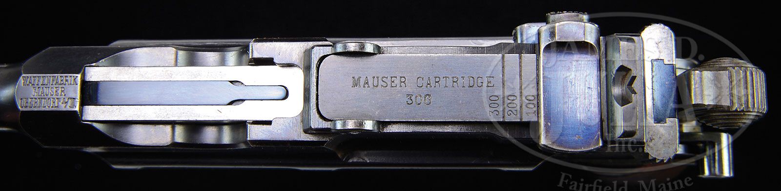 SCARCE MAUSER C96 CONEHAMMER WITH MAUSER CARTRIDGE 303 REAR SIGHT AND SHOULDER STOCK. SN 2749. Cal. 7.63mm. 5.5” bbl and Mauser Cartridge 303 rear sight. This early Conehammer has all standard features except the very unusual Mauser Cartridge 303 rear sight whose cursor is numbered 3050; the sight bar was not removed for a SN check. Otherwise, the gun is entirely matched including the follower, floorplate, bolt, firing pin, firing pin retainer, hammer, bbl extension, locking block, all numbered subframe components, trigger, and both grips. Accompanied by a refinished Conehammer shoulder stock. PROVENANCE: Ralph Merrill Collection CONDITION: The pistol has 95-97% original rust blue. There is contact wear at the bottom of the forward magazine well and toning of the front and backstrap. The extractor has been re-fire blued and the entire rear sight bar is fire blued. The cursor, bolt stop, safety, and firing pin retainer all have at least 95% of their orig fire blue. Bore with strong rifling and mild corrosion. The stock body and lid have a barely discernible repaired crack. The lug has been renumbered to match the pistol. Highly attractive C96 Conehammer with very scarce Mauser Cartridge 303 rear sight accompanied by a nicely refinished and non-factory matched Conehammer shoulder stock. (Antique). 4-47199 LMA21 (4,000-7,000)