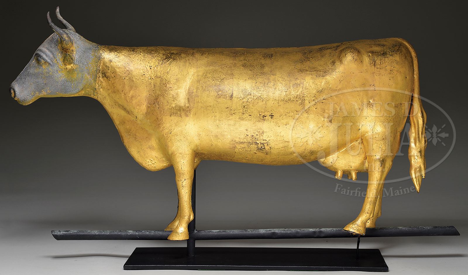 LARGE MOLDED COPPER COW WEATHERVANE. Last quarter 19th century, New England. With strong similarities of those made by Harris and Cushing & White. This fine example with zinc head and gilt body with wavy molded tail and pronounced udder. Now accompanied with a museum stand. Note: This nice example sold at Guyette & Schmidt auction April 27-28, 1995 lot 314. SIZE: 21″ h x 38″ l x 7-1/2″ w. CONDITION: With old gilded surfaces, and with traces of gilding on head. Minimal and minor spots of restoration, and with small seam splits at shoulders and proper right rear hoof. Otherwise very good. 9-29029 (7,000-9,000)