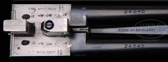 *VERY FINE “GOLDEN AGE” JAMES PURDEY LIGHT GAME GUN AND CASE. SN 24545. (ca 1932) Cal. 12 ga. 2-1/2″ Chambers. Nicely struck 28″ chopper lump bbls are engraved “J. Purdey & Sons. Audley House, South Audley Street, London.” and “Made of Special Super Nickel Steel” on narrow swamped game rib. Bbl flats are stamped with London nitro proofs for 2-1/2″ chambers. Splinter is engraved “Made in England”. SNs are on bottoms of bbls. Tube nos. 61119 and 61120 are on loop. Barrel makers initials “J.W” (Joe Watts) are on bottom of left bbl. Case hardened Beesley patent self-opening sidelock action features automatic safety (SAFE inlaid in gold), raised rib tumbler end cocking indicators, bushed strikers, and gold-plated triggers and other internal parts for moisture resistance. Action and locks are engraved with exceptionally well cut Purdey House style rose and scroll. “J. Purdey & Sons” is on each lockplate and bottom of action, which is also engraved “London”. Gun is no. 1 of a pair, with “1” inlaid in gold in the usual places. Partially marbled and nicely figured European walnut straight grip buttstock measures 14-3/4″ over checkered wood butt, and features drop points, standard checkering, and a vacant gold oval on bottom. Matching splinter ejector forend with Anson release is stamped with initials “F H” (long time Purdey actioner, Fred Hughes). Bore diameter: left -.729, right -.730. Bore restrictions: left -.025, right -.006. Wall thickness: left -.029, right -.031. Drop at heel: 2-1/4″, drop at comb: 1-1/2″. Weight: 6 lbs. 3 oz, LOP 14-3/4″. Leather motor case with stitched leather corners is lined in burgundy cloth with gold embossed makers label on lid, and secondary paper label showing “correct method of placing gun in case”. CONDITION: Excellent. Bbls retain 90 – 93% of what appears to be orig blue, silvering at muzzles, thinning at normal carry point, with a few minor marks. Action retains 70 – 80% orig case hardening color, thinning on bottom, beads, and fences. Lockplates retain nearly all of their orig vibrant color. Action and locks have been re-lacquered, and appear a bit frosted. Top lever is slightly silvered at thumbpiece. Trigger guard retains most of its orig blue, gray at grip. Gold-plating of front trigger has worn through from finger wear. Stocks retain most of their orig oil finish, with possibly some oil rubbed in as maintenance, over a number of minor marks and light scratches. Checkering is slightly worn. Bores are excellent, bright and shiny throughout. Orig damascening is on breech ends. Action is tight. Bbls are on face. Drop is good. Ejectors are perfectly timed. Case leather is very fine with some minor marks and scuffs, especially on corners. Straps and handle are good. Interior cloth is fine with some light soiling. Label is fine with some compressions. Paper label has some stains. A beautifully balanced fast handling gun, built during the acknowledged heyday of British gun making. 4-46764 MGM193 (27,500-37,500)