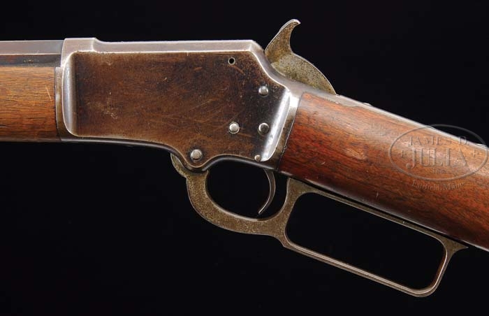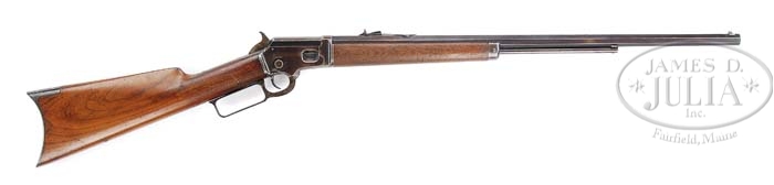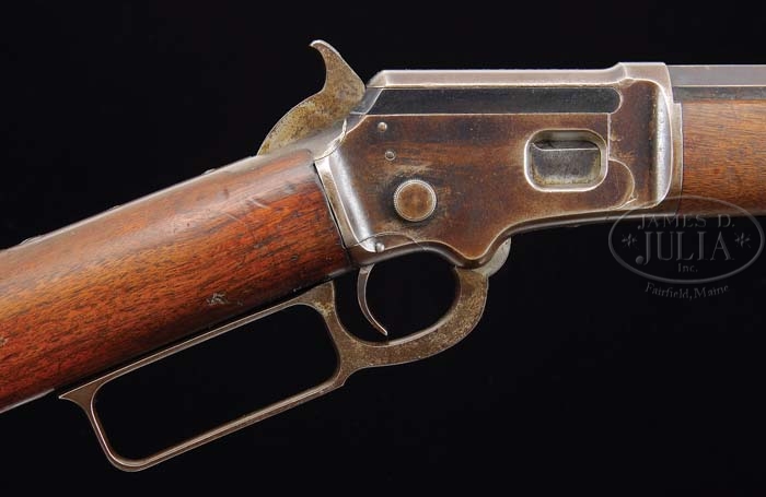 VERY SCARCE MARLIN 1891 SIDE LOADING LEVER ACTION RIFLE. SN 52968. Cal. 22. 23-1/2″ oct bbl, dovetailed blade front sight, sporting rear sight with elevator. Top flat of bbl is marked “MARLIN FIRE/ARMS CO. NEW-HAVEN. CT. U.S.A./PAT’D NOV.19.1878.APRIL2.1889.AUG.12.1890.” Take down receiver with rare right side rebated loading gate, round top marked “MARLIN SAFETY”. Mounted with nicely figured straight grain walnut, straight grip, crescent steel buttplate, standard forend with nosecap. Inspection of top tang channel of stock reveals matching SN to receiver. PROVENANCE: Ted Knee Collection. CONDITION: Very good to fine. Bbl retains orig blue that is blending and toning to a brown patina, thinning on sharp edges, typical nicks, dings & scrapes, and a few areas of shallow surface oxidation. Mag tube has flaked with blue in protected areas, retaining a silver mixed with brown patina. Receiver shows orig blue blending with brown patina and silvering on sharp edges. Lever and hammer retain a silver/brown patina finish. Stock is sound with typical nicks, dings & handling marks, a small dent left side in grip area, retaining orig finish blending with hand worn patina in grip area. Buttplate has turned a gray patina blending with dark brown. Forend is sound with nicks, dings, bumps & bruises, retaining traces of orig finish blending with hand worn patina. Mechanics are crisp, descent bore, with slightly dark grooves and some shallow scattered pitting. 4-36636 BDT150 (3,000-5,000)