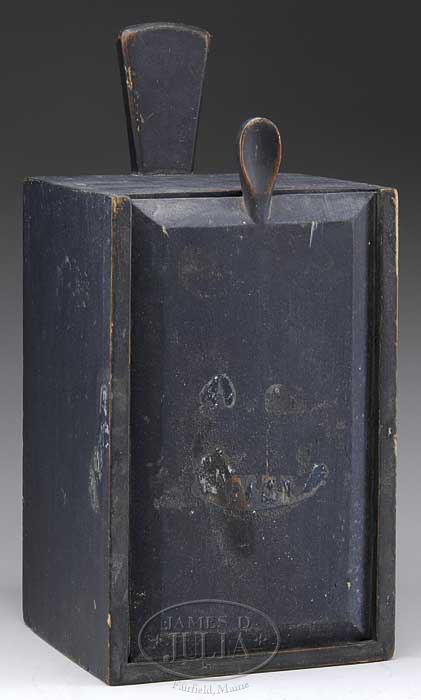 FINE PINE CANDLE BOX IN ORIGINAL GREEN PAINT. Early 19th century, American. The rectangular box fitted with a sliding chamfered lid carved with a teardrop thumb grip handle. In dark green paint. SIZE: 14-3/4″ h overall x 6-7/8″ w x 7″ d. CONDITION: Structurally very good with normal and expected wear to painted surfaces. Lid with some old staining. 7-70021 (800-1,200)