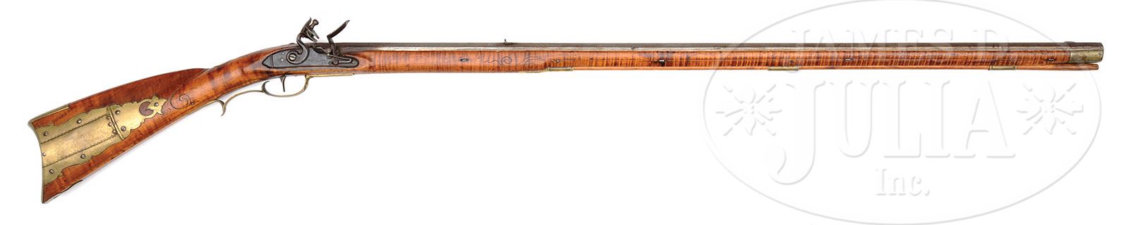 RELIEF CARVED GUN ATTRIBUTED TO WOMELSDORF GUNSMITH LEONARD REEDY. SN NSN. 40-1/2″ full oct 54 Cal. smooth bbl stamped “I. Roop”. Flintlock is stamped “W. Ketland” and appears to be original flint. Relief carving to the rear and forward of the cheekpiece all are Leonard Reedy’s signature carving as is the carving around the bbl tang. Four piece brass patchbox, with its one piercing and four-petaled flower finial, is not engraved. Stock is honey colored and tiger-striped. Incised carving on each side at the rear ramrod entrance ferrule. PROVENANCE: See Thoughts on the Kentucky Rifle in Its Golden Age, 1960, by Kindig Jr. Collection of Dr. Douglas Sirkin. CONDITION: Rifle at one time was broken through the lock area and repaired. Wood repaired with some replacement in lock area. Cracks in lock area and the wood screw at the tail of the sideplate. Some wood added from muzzle back. 4-50069 RG51 (8,000-12,000)