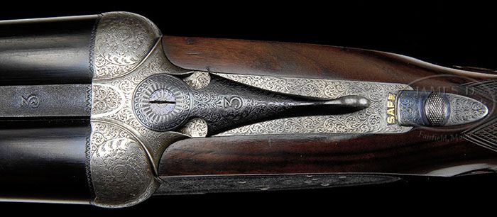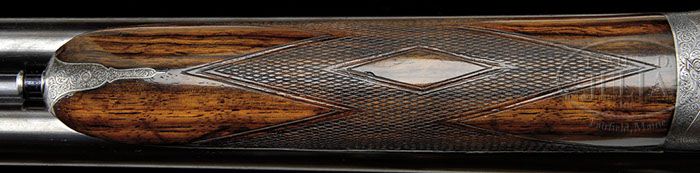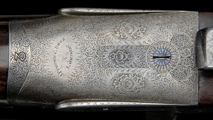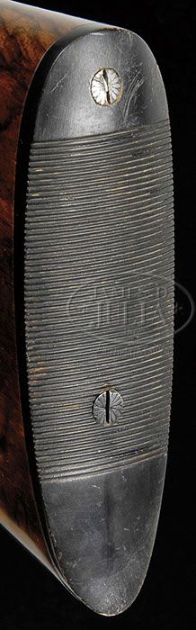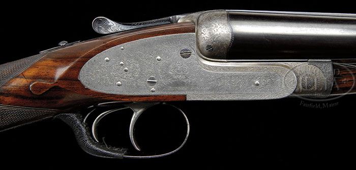 Correction: Lot 2362, 2365 and 2368 were owned by Winston Franklin Churchill Guest, not lots 1333, 1334 and 1335 as stated in the catalog. *RAYMOND GUEST’S VERY FINE PURDEY BEST SIDELOCK EJECTOR PIGEON GUN. SN 24191. Lots 1333, 1334 & 1335 were owned by the internationally known sportsman and Ernest Hemingway confidant, Winston Franklin Churchill Guest. Winston Guest and his celebrity wife “CZ” Cochrane Guest were married at Hemingway’s house “Finca Vigia” in Havana in 1947 with Hemingway as best man. Guest and the American government outfitted Hemingway’s sportfisher “Pilar” during the much chronicled hunt for German U-boats in the Gulf Stream during WWII and was one of the crew. The Hemingway double rifle aboard “Pilar” which Julia’s sold in the March 2011 auction for $339,250 was a gift from “Wolfie” as Hemingway called him. The two hunted extensively together in the Americas and made several trips to Africa. English born Guest was a ten goal polo player who led Yale’s polo team to the intercollegiate championship. He became an American citizen at age 21 in order to play on the USA international polo team. He won the International Polo Cup for America against England in 1930. 1936, and 1939, versus Argentina in 1928 and 1932, and against Mexico in 1941. His grandmother was Lady Cornelia Spencer – Churchill, daughter of John Churchill, 7th Duke of Marlborough. He was Godson, second cousin and namesake of British Prime Minister Winston Churchill. Cal. 12 ga. 2-3/4″ Chambers. Factory records indicate completed in August 1931 for Raymond Guest, US Ambassador to Ireland and Winston Guest’s brother. Nicely struck 30″ chopper lump bbls with concave matted high rib, are engraved with Purdey Audley House address, and Whitworth Steel information on tops. Rear of rib, top lever, and forend iron are engraved with “3”. Bbl flats are stamped with London nitro proofs for 2-3/4″. Bottoms of bbls are stamped with “Choke”, SNs, and bbl makers initials “J.W” (Joe Watts). Tube nos. 60200 and 60201 are on loop. Splinter is engraved “Made in England”. Heavy Beesley patent self-opening sidelock action features automatic safety (SAFE inlaid in gold), bushed strikers, Purdey third fastener, side clips, raised rib tumbler end cocking indicators, and articulated front trigger. Action is engraved with Purdey house style rose bouquet and scroll with “J. Purdey & Sons” engraved on lockplates and bottom of action. Scroll engraved trigger guard has SN at grip, and is fitted with leather recoil shield at rear of bow. Nicely marbled and lightly figured European walnut straight grip buttstock measures 15-3/8″ over ribbed horn buttplate. Stock features drop points, 20 LPI point pattern checkering with mullered borders, and vacant silver oval on toe line. Matching splinter ejector forend has Anson release, Actioners initials “H-L” (Harry Lawrence) are on iron. Bore diameter: left -.732, right -.732. Bore restrictions: left -.024 with .002 recess, right -.017. Wall thickness: left -.032, right -.032. Drop at heel: 2-1/8″, drop at comb: 1-1/2″. Weight: 7 lbs. 5.5 oz. LOP 15-3/8″. Brown leather “Universal” case is lined in red cloth with reproduction Purdey label. PROVENANCE: One of three Purdey guns obtained by the consignor directly from the family of Winston Guest. CONDITION: Very fine. Bbls retain nearly all of an old re-black. Action and lockplates are mostly pewter gray with traces of case color in protected areas. Trigger guard and top lever retain most of an old charcoal blue with engraving slightly washed. Screws show some use, and have been fire blued. Buttstock is a replacement, by Purdey in 1967, and retains nearly all of its rubbed oil finish. Orig forend wood matches this finish with some oil in borders of checkering. Bores are very fine, with some very light pitting evident at breech ends of bbls, and slightly frosted toward muzzles. Action is tight. Bbls are on face. Ejectors are in time. Case is excellent. A good solid well balanced gun, built during what some acknowledge as the best period of English gun making, and actioned by Harry Lawrence himself! 4-40349 MGM30 (18,000-23,000)