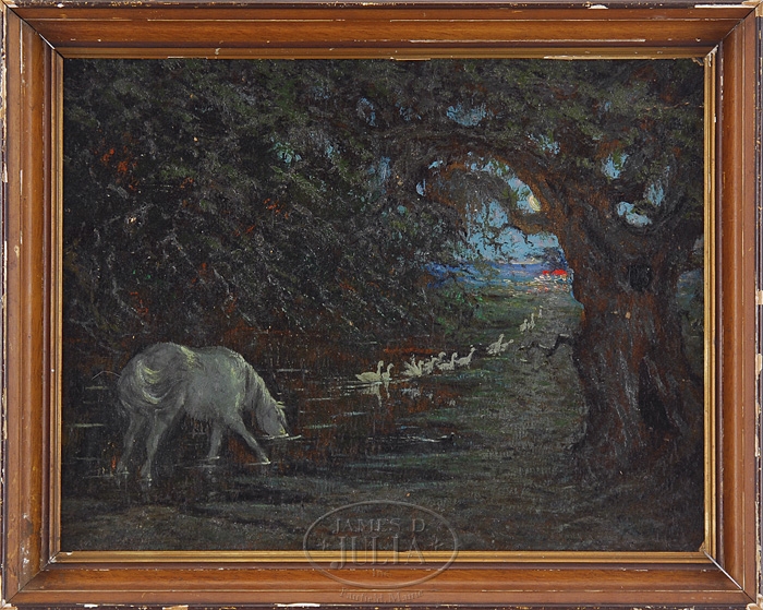 ATTRIBUTED TO ELLIOTT DAINGERFIELD (American, 1859-1932) UNDER THE MOONLIGHT. Interesting oil on board nighttime scene shows a white horse drinking from a small area of water beneath large trees. A procession of white geese walks toward building and distant water under a partially obscured moon in blue sky. Housed in a period wood frame. SIZE: 17-1/2″ x 23″. CONDITION: Very good with two corner chips which can be hidden by a frame. 9-96988 (1,000-2,000)