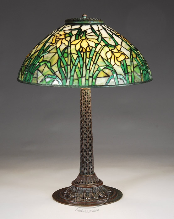 TIFFANY STUDIOS DAFFODIL TABLE LAMP. Leaded shade begins with a floral daffodil pattern constructed with fairly dense green, amber and white striated opal with faint mottles and extensive surface freckling in the background. The flowers are constructed with a yellow to white translucent opal with faint mottles and extensive freckling and the centers correspond with the same coloration but having a rippled texture. The leaves are in various shades of green striated glass with some mixed with yellow and scattered mottling. Shade is signed “Tiffany Studios New York 1449-29”. When a shade has a dash number in the signature, it was considered to be a prime example. Shade is supported by an extremely rare and unusual Gentian base with an openwork stem and petal design at the foot with beading above and below. Base is completed with three key sockets, riser, wheel and top cap with all having a desirable patina finish. Base is signed “Tiffany Studios New York 871”. Lamp is accompanied by a letter of authentication from Paul Crist Studios, Inc., Santa Fe Springs, CA. SIZE: Shade is 16″ dia. Overall 22″ t. CONDITION: Shade is very good with several tight hairlines having no missing glass and base is very good to excellent. 5-66869 (40,000-50,000)
