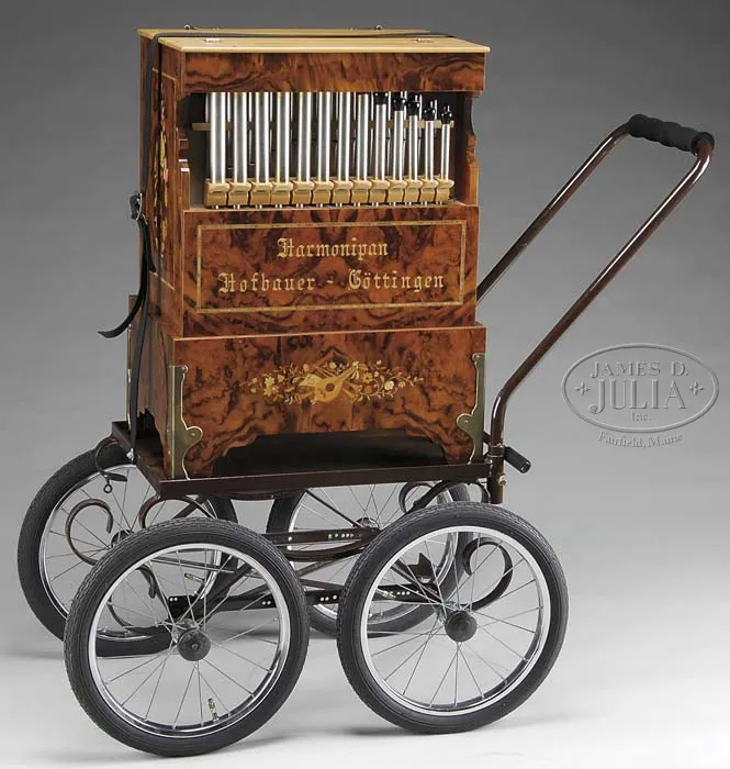 HOFBAUER HARMONIPAN MONKEY ORGAN. Contemporary roll operated organ. Beautiful hand-cranked organ with burl walnut case and inlaid flowers, musical instruments and its name “Harmonipan Hofbauer – Gottingen”. Brass corners and trim with exposed pipes in the front on a nice cart with large wheels. Plays 20-note multi-tune roll with beautiful sound. SIZE: Organ: 14″ w x 27″ h x 20″ d. With cart: 44″ w x 43″ h x 22″ d. CONDITION: As new condition, very well maintained. 1-10982 (4,000-5,000) Auction: Advertising, Toy & Doll - Spring 2011 Please Note: All prices include the hammer price plus the buyer’s premium, which is paid by the buyer as part of the purchase price. The prices noted here after the auction are considered unofficial and do not become official until after the 46th day. |
