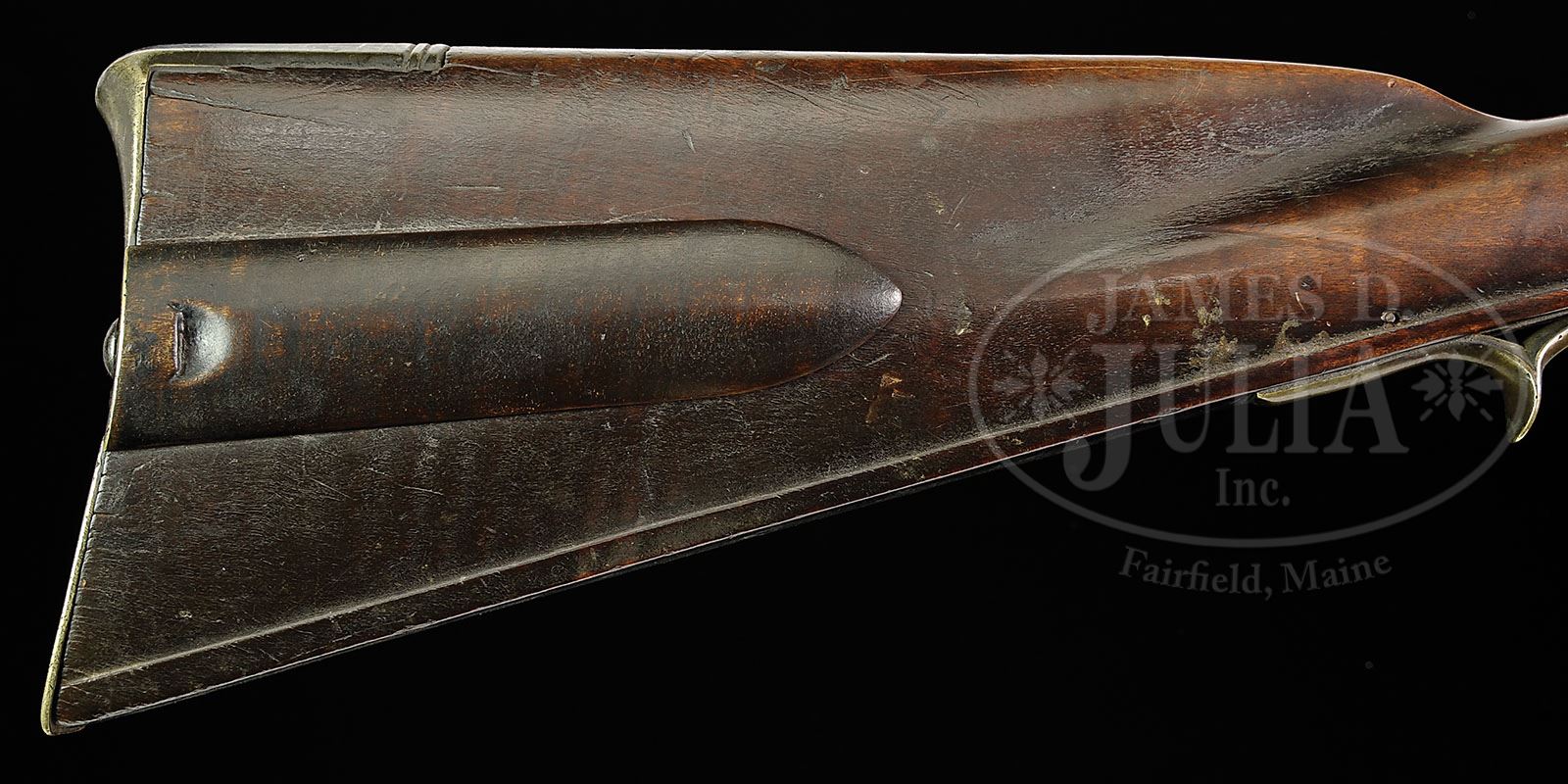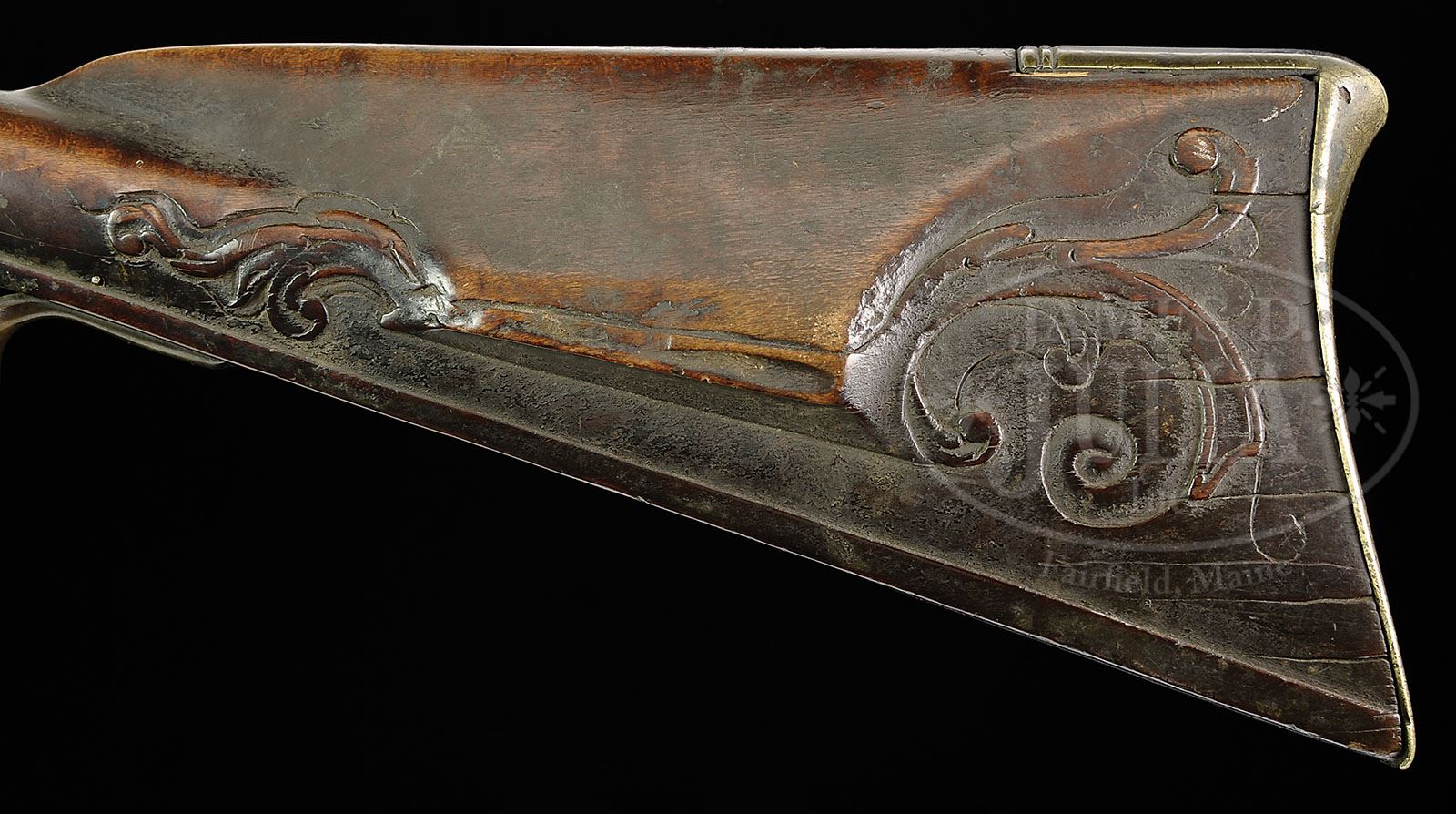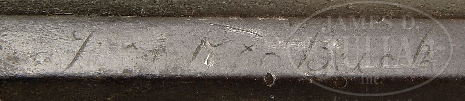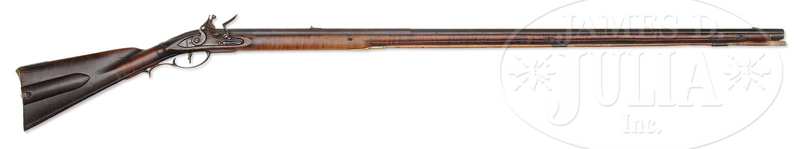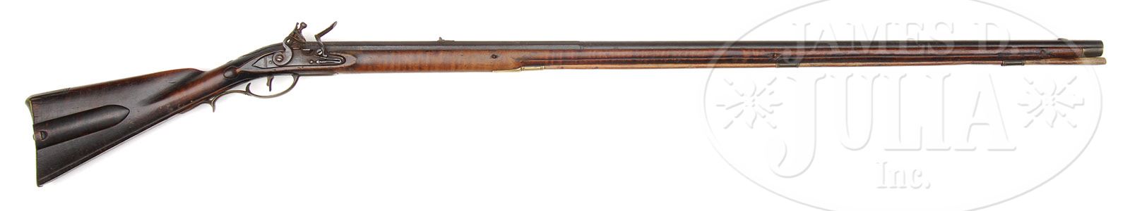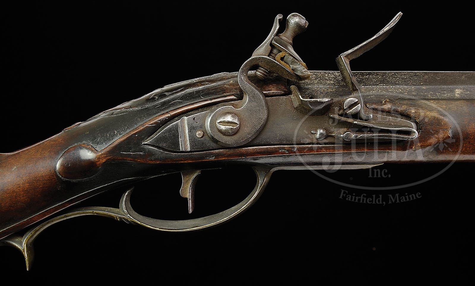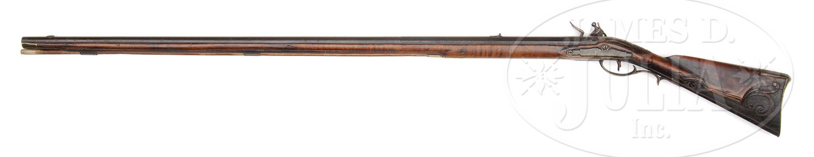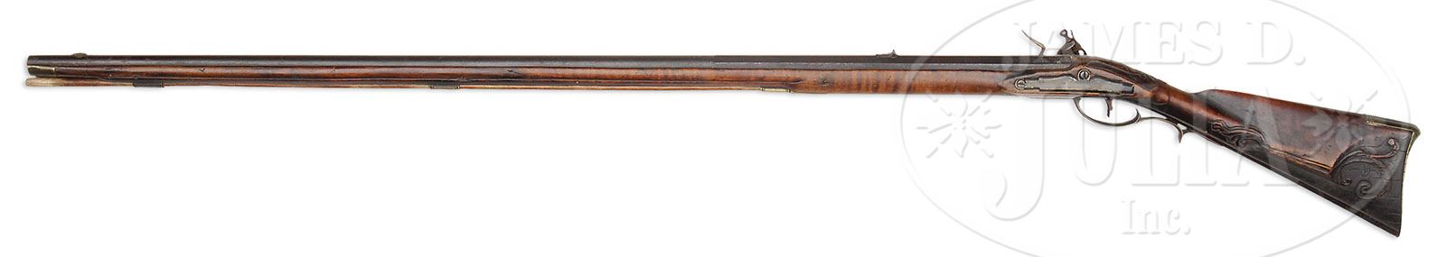 OUTSTANDING RELIEF CARVED J.P. BECK RIFLE. This early rifle has a 43-1/2″ oct to rnd .58 cal straight rifled bbl signed in script J.P. Beck. The gun features a wood patch box and a curly maple stock. The trigger guard features Beck’s typical two deep lines forming a molding on the forward end of the guard. The short ramrod pipes have heavy molded ends and the nose cap has Beck’s characteristic three rivets placed at a triangle to fasten the muzzle cap to the stock. The gun is relief carved at the bbl tang and on the cheek side of the butt. The high relief carving is well designed, crisp, well defined and well executed. The side plate is thick beveled brass and is nicely engraved and the bbl is pin fastened to the stock. Some of the finest rifles of the early period were produced in the Lebanon school by J. P. Beck. John Philip Beck worked from the 1760’s until his death in 1811. He is recorded as a gunsmith in Lebanon Borough from 1781 to 1810. CONDITION: There is a 7-1/2″ by 1/2″ wood repair on the left side of the bbl above the middle ramrod ferrule. The lock has been reconverted to flint. Overall condition is very good with attractive high relief carving that is dry and untouched. The ramrod appears to be orig. The wood door is an old replacement. Side plate is a replacement. There is a small glued crack on the left side at the muzzle. 4-49723 (40,000-60,000)