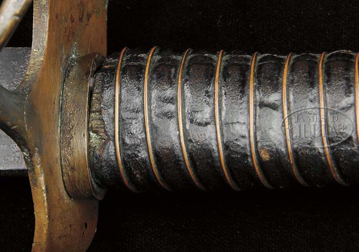 CONFEDERATE WOOD SCABBARD CAVALRY SABER. This is a very good example of the popular wood scabbarded Confederate Cavalry saber thought to have been made in Georgia or South Carolina. Regardless of where these swords were made we know that examples were captured by Gen. G.A. Custer in Virginia and also that Gen. Joseph Wheeler’s cavalry were issued these swords in the Western theater. This example has a fairly straight 32″ blade with a wide, unstopped fuller. Leather grip retains most all its orig leather & single strand copper wire wrap. The tin scabbard mounts retain much of their orig. black japanning. The brass hilt, pommel, ferrule, and sword ring mounts retain good patina as can be seen in photos. CONDITION: Blade is gray overall with scattered areas of pitting, old sharpening and blade has been re-tipped. The hilt has a bend in its largest branch as can be seen in pictures. Bend appears to have been made by a sharp blow, maybe from a bullet? Hilt retains a protective leather washer which is possibly restored. The orig leather grip wrap has shrunk and pulled apart revealing a small gap about 1/4″ wide. The wooden scabbard is sound & solid though there are two longitudinal cracks, one with an old glued repair near drag. Middle mount is missing one of its four attaching pins and the top mount is missing three of its four attaching pins & its throat. These throats are often missing as they were lightly soldered in place and many excavated examples are known from Confederate Cavalry battlefield and camp sites. 4-45786 JS3 (5,000-7,000)