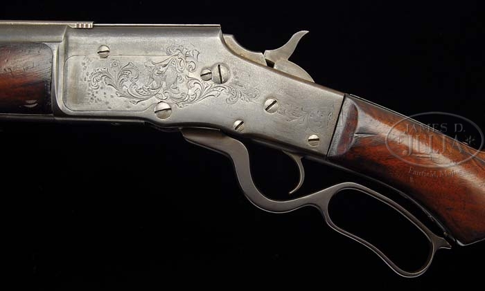 SCARCE ENGRAVED LARGE FRAME BULLARD MODE 1886 LEVER ACTION RIFLE. SN 674. Cal. 40-60 Bullard. Scarce semi-deluxe engraved rifle with 28″ oct to rnd bbl, full magazine, slightly altered half nickel front sight and semi-buckhorn rear sight. Caliber marking is barely visible over chamber area of receiver with SN back of hammer slot. Receiver is lightly engraved with the vignette of a walking black bear on left side and a raccoon on right side, surrounded by foliate arabesque patterns. Rear ends of frame have small vignettes of dogs’ heads. Rifle is mounted with very nicely figured, uncheckered American walnut with pistol grip stock and “Bullard Repeating Arms” hard rubber buttplate with elk logo. The Bullard Mfg. Co. was in business in Worcester, Massachusetts from the mid-1880’s to June 1891. It produced a very high quality lever action rifle, probably of substantially higher quality than any of their competitors. Unfortunately poor management and a more expensive product than their competitors led to their downfall after only a few thousand rifles had been produced. Bullard rifles were produced in any popular caliber of the day plus their own proprietary cartridges, such as this one. The proprietary cartridges soon lost favor with the public and eventually faded into obscurity. Bullard rifles were the smoothest and least prone to wear of all the rifles of their day. CONDITION: Good to very good. No orig finish remains being an overall artificially aged gray/brown patina with fine pitting over most of surfaces. Left side of receiver has a series of small hammer marks on sideplate. Top tang is broken from receiver and there is a small fill area back of top tang. Stock & buttplate have a chipped toe, otherwise wood is sound with forearm having a small gouge by bbl channel with nicks, dings & scratches and is a dark hand worn patina. Buttstock has usual handling & use marks and retains most of its orig varnish. Top extractor is broken which causes the dust cover to malfunction during operation, otherwise mechanics are fine, smooth, bright shiny bore. 4-38122 JR349 (2,500-4,000)