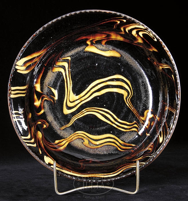 SHALLOW REDWARE BOWL W/YELLOW SLIP DECORATION. Late 19th-early 20th century. Dark coffee with strong yellow slip marbleized decoration and coggled rim, all with high glaze interior. SIZE: 2-1/4” h. x 11” dia. CONDITION: Very good overall. 9-99765 (400-600)