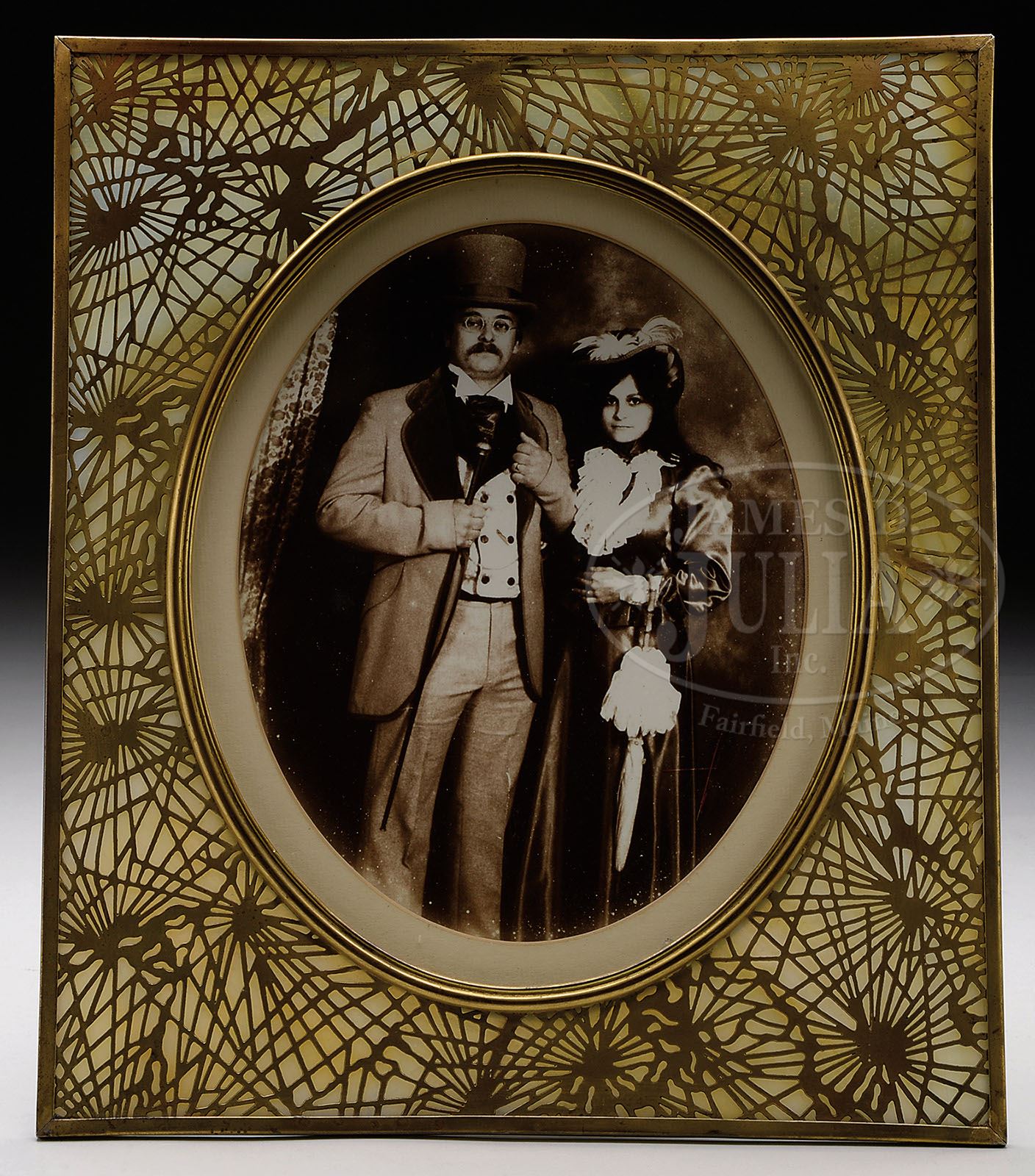 TIFFANY STUDIOS PINE NEEDLE PICTURE FRAME. Tiffany Studios picture frame has acid etched pine needle pattern with caramel slag glass backing and an oval opening for the photo. Frame is finished in a bright gold patina and is signed on the back “Tiffany Studios New York 917″. SIZE: Overall is 12″ x 14″. Opening is 8-1/4″ x 10-1/4”. CONDITION: Very good to excellent with some minor discoloration to patina. 5-67549 (1,500-2,000)