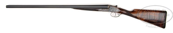 *BOSS BEST SIDELOCK EJECTOR GAME GUN. SN 7215. (ca 1925) Cal. 12 ga. 2-3/4″ Chambers. 29″ Chopper lump bbls are engraved “Boss & Co. 13, Dover Street, Piccadilly, London England.” on narrow, concave game rib. Gun is one of a pair and has “1” inlaid in gold in the usual places. Tops of bbls are engraved “Sir Joseph Whitworths” “Pressed Fluid Steel”. Bbl flats are stamped with London nitro proofs for 1-1/8 oz of shot. Bottoms of bbls are stamped with SN and “sheaf of wheat” logos. Case hardened sidelock action is stocked to the fences and features automatic safety (SAFE inlaid in gold), raised rib tumbler end cocking indicators, and double triggers. Action and lockplates are engraved with exceptionally well cut, very small, shaded scroll with 20 rose bouquet highlights, most likely done by noted engraver Jack Sumner. “Boss & Co” is in scrolled terminated riband on each side of action. Single beaded trigger guard is also scroll engraved and has SN on long tang. Fine, dark marbled and nicely figured Circassian walnut straight grip buttstock measures 14-7/8″ over dark brown leather covered pad, and features drop points, point pattern checkering with mullered borders, and a vacant silver oval on toe line. Matching splinter forend with Anson release is fitted with Boss’ patent ejectors known for extracting cartridges well clear of bbls. Bore diameter: left -.730, right -.730. Bore restrictions: left -.010, right -.006. Wall thickness: left -.028, right -.030. Drop at heel: 2″, drop at comb: 1-3/8″. Weight: 6 lbs. 12 oz, LOP 14-7/8″. New brown leather case with stitched leather trim, is lined in burgundy cloth, and contains a pair of Pachmayr snap caps. CONDITION: Very fine. Bbls retain 90% of an old satin re-blue, engraving on tops of bbls picked up. Action retains a considerable amount of orig case hardening color, vivid under fences. Locks retain some color, dark at tails. Top lever retains most of what appears to be its orig blue, with silvering at thumbpiece. Trigger guard has been re-blued and retains nearly all of that blue. Stocks retain most of an old hand rubbed oil finish, sharp edges slightly softened, checkering freshened. Bores are excellent, bright and shiny throughout. Action is tight. Ejectors are perfectly timed. Case is excellent. Interior cloth has some rubs and soiling, some blocking is missing. 4-46994 MGM220 (18,500-27,500)