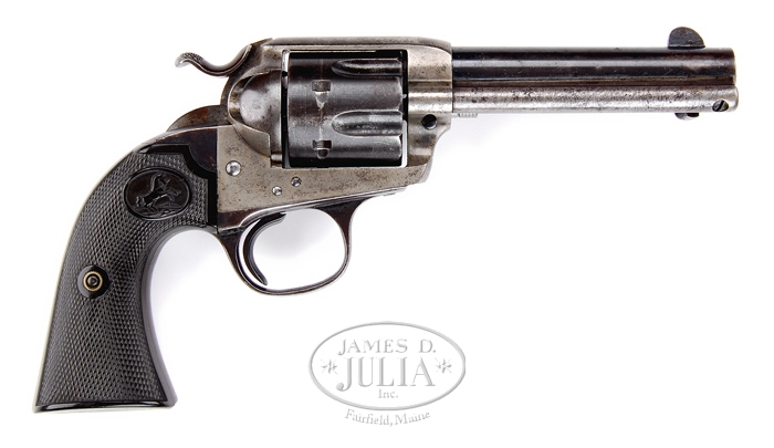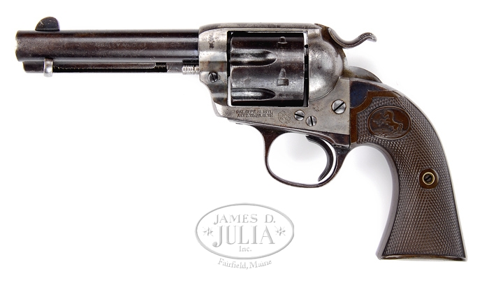 *COLT SINGLE ACTION ARMY BISLEY REVOLVER. SN 266194. Cal. 38 WCF (38-40). Fine Bisley with 4-3/4” bbl, full front sight with 2-line address and standard Bisley markings on left side. Frame has 2-line patent dates and rampant Colt in a circle and it has rampant Colt hard rubber grips. Base pin is a modern replacement. CONDITION: Fine. Bbl retains 70-75% orig blue with left side turned plum. Ejector rod housing is mostly a blue/gray patina. Frame retains 20-25% case colors mostly in sheltered areas with balance turned silver. Trigger guard & back strap retain blue in sheltered areas with balance turned plum. Grips show moderate wear turning chocolate. Hammer is not solid in half cock, otherwise mechanics are fine, bright shiny bore with scattered light pitting. 4-33646 JR613 (2,500-4,000)