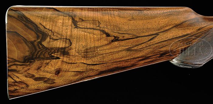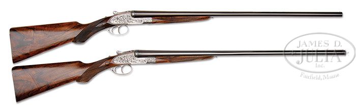 *EXCEPTIONALLY FINE CASED PAIR OF HOLLAND & HOLLAND ROYAL DELUXE 20 BORE GAME GUNS. SN 41213/ 41214. Cal. 20 ga. 3″ Chambers. This very fine, and unusual, pair of guns, nos. “1” and “2” inlaid in gold on breech ends of bbls, top levers, and forend tips, have finely struck 28″ chopper lump bbls with medium, concave game ribs engraved “Model Deluxe”. Tops of bbls are engraved “Holland & Holland 33, Bruton Street, London.” Bbl flats are stamped with 1993 London proofs for 20 ga. 76mm chambers at 1200 bar. Bbls are fitted with Holland & Holland patent self opening assist spring. Bottoms of bbls are stamped with SNs. Nicely filed coin finished sidelock actions feature automatic safeties (SAFE inlaid in gold), gold line tumbler end cocking indicators, H & H detachable locks, and double triggers. Actions and lockplates are engraved with very well cut semi-relief large open scrolled acanthus, with finely stippled backgrounds. “Holland & Holland” is in large scrolled riband on each lockplate, and “Royal” “DE” and LUXE” are in lozenge on bottom of each action. Single beaded trigger guards have matching scrolled acanthus with SNs inlaid in gold on tangs, which extend to engraved steel caps. Striking, flesh-toned and dark marbled, nicely figured European walnut unusual “Prince of Wales” capped grip buttstocks measure 14-3/4″ over checkered wood butts with scalloped and engraved steel heel and toe plates. Stocks feature diamond hands, point pattern checkering with mullered borders, drop points, and gold ovals on toe lines engraved “J. L. J.” Matching ejector forends have Anson releases. Bbl set Number 1: Bore diameter: left -.615, right -.613. Bore restrictions: left -.006, right -.002. Wall thickness: left -.036, right -.036. Drop at heel: 2-3/16″, drop at comb: 1-7/16″. Weight: 6 lbs. 10 oz, LOP 14-3/4″. Bbl set Number 2: Bore diameter: left -.612, right -.612. Bore restrictions: left -.014, right -.004. Wall thickness: left -.031, right -.032. Drop at heel: 2-1/4″, drop at comb: 1-7/16″. Weight: 6 lbs. 10 oz, LOP 14-3/4″. Best makers oak and tan leather double gun case with brass corners and central brass medallion on lid, has leather trimmed brown canvas outer cover, with central medallion embossed with initials “J L J”. Interior is lined with dark green cloth, with large black leather gold embossed Holland & Holland label, with semi French fitted compartments for both guns and accessories. Accessories include 2-pc cleaning rod still in its orig wrapper, 3 ebony handled turnscrews, 2 pairs of H & H marked snap caps, H & H marked square oil bottle, and two nickel-plated striker bottles marked “1” and “2” containing spare strikers. Covered compartments contain mops and brushes as well as keys. Also included are H & H marked can of Rangoon oil, box of cleaning patches, and bench cloth. CONDITION: Essentially as new, possibly unfired since proof, with only the faintest of minor marks on wood or metal. Case and accessories are also near new, with only some minor scuffing of leather on outer cover, and fading of canvas. 4-46291 MGM25 (75,000-100,000)