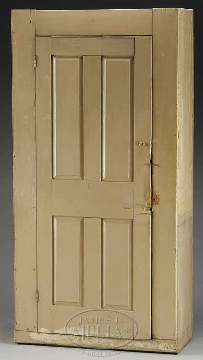 NEW ENGLAND PINE SINGLE DOOR CUPBOARD. Mid 19th century, probably Maine. The door with four raised panels opening to an interior fitted with three stepped shelves over three deep shelves. Originally with a red wash, now in later, but early, beige paint. SIZE: 81″ h x 41″ w x 18″ d. CONDITION: Very good. Top of door has been built up. With nicely worn surfaces. 9-26364 (800-1,200)