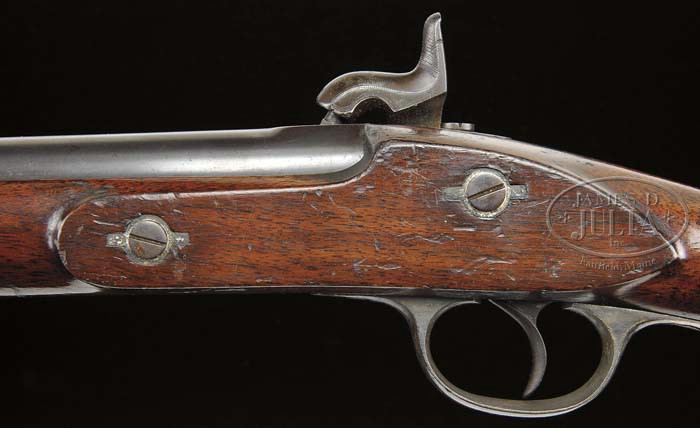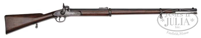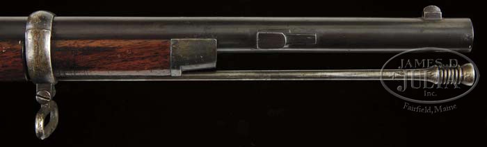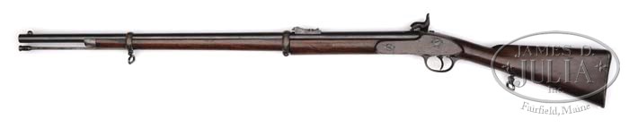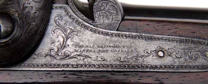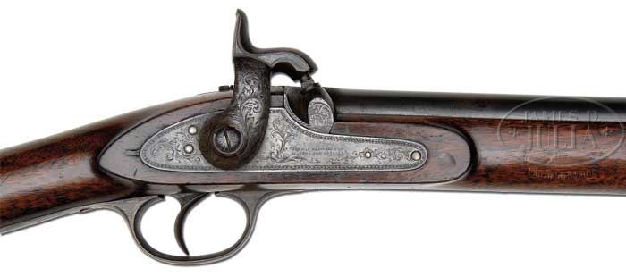 RARE AND UNIQUE THOMAS, GRISWOLD & CO NEW ORLEANS CONFEDERATE MILITARY RIFLE. Cal. 58. 33″ bbl. This is the only known Thomas, Griswold & Company maker marked Confederate rifle. This particular specimen is extremely well made and decorated for presentation or exhibition. Thomas, Griswold & Company was a very well known manufacturer of Confederate swords. Thomas, Griswold had a large operation and many workers and his swords are among the very finest of Confederate officer’s swords. Thomas, Griswold was famous for their brass scabbarded officer’s swords of all types. Thomas, Griswold also made some of the highest grade presentation swords in silver. Thomas, Griswold had few peers in the highest grade Confederate presentations. Some of his best swords were given to high ranking Generals such as Sterling Price. That sword is now in the collection of the Museum of the Confederacy in Richmond, Virginia. Another high grade General sword made by this firm was presented to General Christopher Mott. Many high grade swords made by this firm are in institutions nationwide. Until discovery of this particular long arm there was no known rifle by Thomas, Griswold. In October 1861 Thomas, Griswold & Company placed classified ads seeking forgers and finishers; Said applicants to apply at “The Rifle Factory” of the subscribers on 3rd Street between Bacchus and Dryades. Between March and April 1862 Thomas, Griswold & Company placed no fewer than 6 ads for two machinists and two gunsmiths. Then New Orleans fell to Union forces. The US government, in a marshall sale, sold “The Confederate Rifle Factory” in December 1864. In a letter by Thomas, Griswold & Company, signed January 21, 1862, to General Albert Sidney Johnston they mention a contract to manufacture Enfield rifles “for our ability to fulfill our contracts we can refer you to Gen. Lovell with whom we made contracts to manufacture Enfield rifles, or to Gen. Ruggles or to Major M.L. Smith of the engineers.” Also in Confederate records is a Confederate ordnance document dated June 30, 1862 from Major Smith of the Corp of Engineers concerning the purchase of “The Rifle Factory” situated on 3rd Street between Bacchus and Dryades Streets, New Orleans. Unfortunately this rifle factory was to produce no more rifles as New Orleans was now in Union hands. Production at Thomas, Griswold & Company Confederate Rifle Factory spanned a mere few months from Autumn of 1861 to Spring of 1862. There are known unmarked Enfield rifles of this configuration that are most likely also made at the Confederate Rifle Factory of Thomas, Griswold & Company; Though earlier thought to be products of Cook & Brothers who made many Enfield rifles bearing their mark in New Orleans and later in Athens, Georgia where they moved their equipment prior to New Orlean’s fall. There are two known saber bayonets marked “Thomas, Griswold & Co, New Orleans”; so there must have been at least a few unmarked rifles manufactured. Also in Major Martin L. Smith’s papers he has a notation on February 21, 1862 of 92 Enfield rifles. There is no designation if they were Thomas, Griswold & Company’s. The extremely well made rifle we are offering here is marked on lock “Thomas, Griswold & Co/Makers.New Orleans”. The lock is beautifully engraved and chased as is the hammer and bbl tang and bolster. Engraving is very similar and most likely done by Thomas, Griswold employees once in the employee of Hyde & Goodrich of New Orleans whose firm Thomas, Griswold bought in mid 1861. Hyde and Goodrich are famous for their silver engraving chasing. Other known Confederate rifles made in New Orleans are also of this pattern and it is interesting that these brass bands and sling swivels are unique to New Orleans manufacture as they are seen nowhere else other than Cook or Thomas, Griswold & Co. This gun no doubt was made to show off the work that could be done at “The Confederate Rifle Factory.” In addition to the engraving, stock is highly polished and varnished. All brass fittings including nosecap, bbl bands, trigger guard, sling swivels, buttplate and lock escutcheons were all silver plated. Bbl is finely rifled but tapered inside at muzzle back 1″ such that a ball could easily be seated into rifling. Bbl was blued and lock and hammer were case colored. This is no doubt the single rarest of all Confederate rifles and also the most attractive. CONDITION: Gun overall is in very fine condition. Bbl retains most of its original blue finish though majority is faded and turned plum. Case colors are only visible in protected area under hammer with balance gray/silver. Brass furniture retains about 80% of original silver plating on all brass parts. Stock is sound and solid with polished furniture-like finish, retaining 95% of original varnished finish. Bore is bright, showing fine thin rifling. Accompanying Enfield ramrod matches gun fairly well but is not original to this gun. 8-76328 JS101 (75,000-125,000)