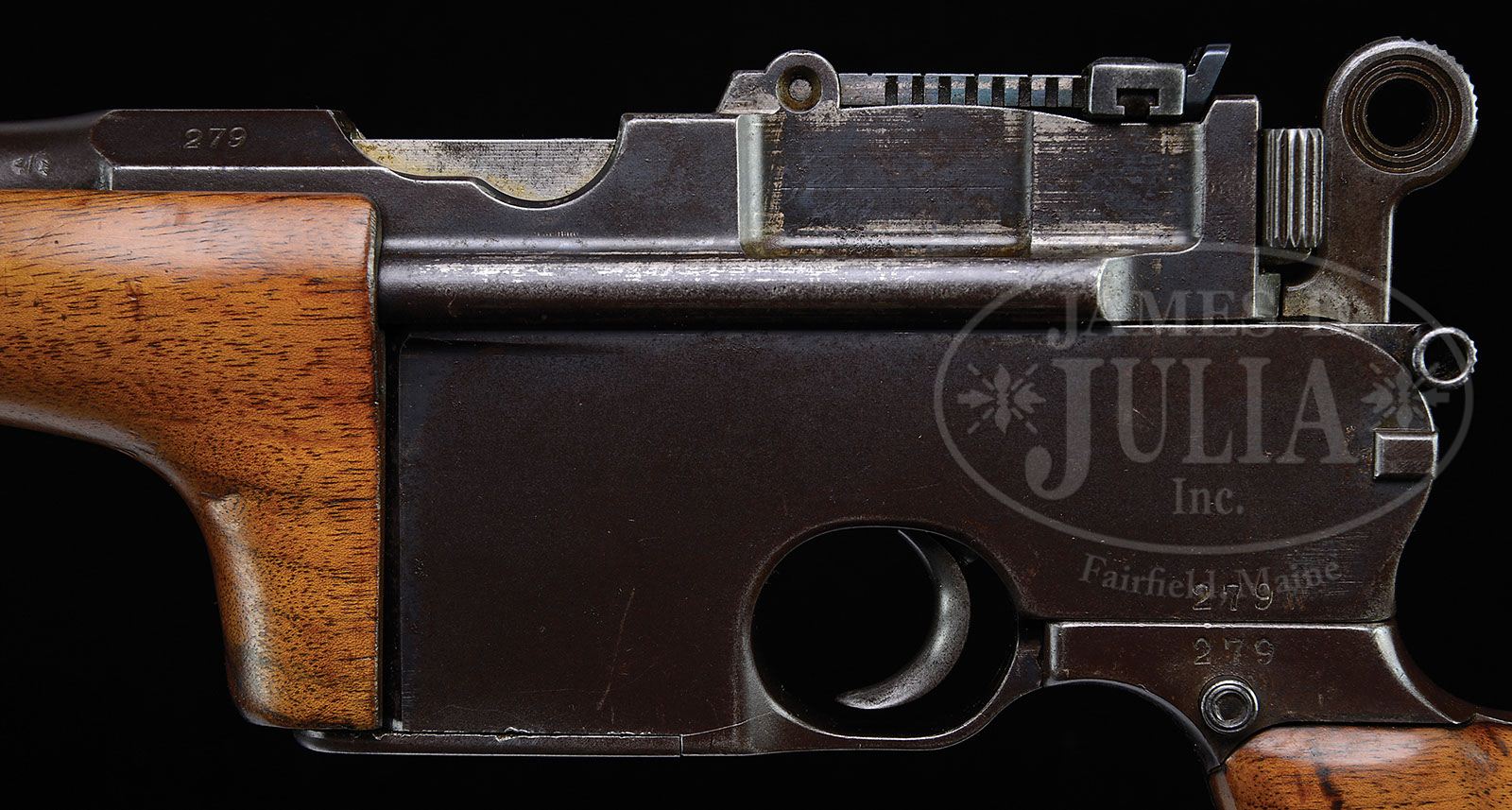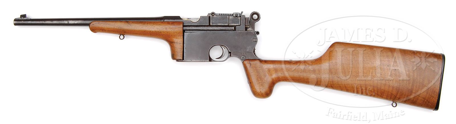 *MAUSER C96 FLATSIDE TRANSITIONAL CARBINE. SN 279. Cal. 7.63mm. Mauser made approx. 1,000 carbines that were numbered in a separate serial range. Characteristically, the chamber has longer flutes and the rails are solid. They have a distinctive forend and a push button detachable buttstock with a Mauser marked buttplate. This gun has a long extractor and slip-in 50-500 rear sight adjusted by a standard (non-grooved) cursor. Bolt has a separate firing pin retainer as used by the Conehammer and Early Transitional Large Ring pistols. Usual Mauser markings on chamber and full SN on left chamber flat that is repeated on the lower portion of the left frame and the left side of attaching iron. Sight assembly and back of hammer have matching SN and the large Westley Richards logo is marked on the left side on buttstock that has the correct Mauser buttplate. Gun comes with a modern leather covered hard case that is compartmentalized for the disassembled carbine. There are separate compartments for a sling, ammunition and a variety of cleaning supplies. Included in the case is a metal oil can whose base is stamped “Made in England”. Case was made by Nizzoli, whose name is marked on a plaque mounted on the inner lid. Brass corners serve to protect the case that is closed with a single brass latch under a leather handle. PROVENANCE: Ralph Merrill Collection CONDITION: Metal on carbine is in generally good condition with most of the surface having turned from a rust blue to a mellow brown patina. Remnants of blue are in the protected areas around the rear bbl extension. Extractor, sight bar and safety have most of their original fire blue finish while of the fire blue from the cursor and bolt stop has faded. Wood is original but sanded and refinished. Even though refinished, the Westley Richards logo on the buttstock can be readily seen. Wear on buttplate is commensurate with the wear on the balance on the carbine. Sling and case are excellent with only minor handling and storage scuffs. (C&R). 4-47302 LMA109 (8,000-15,000)