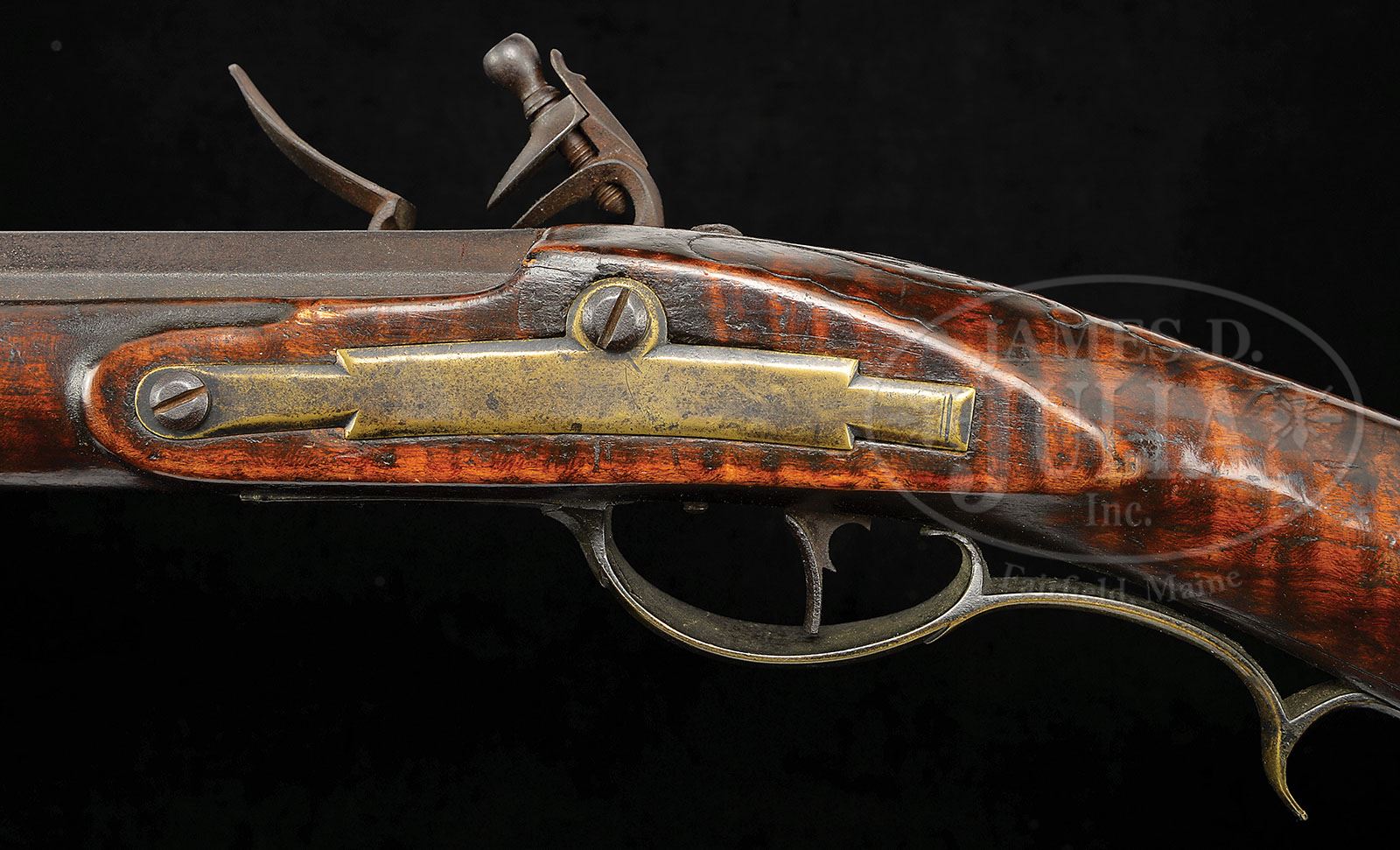 Correction: Estimate should read 15,000-25,000. RELIEF CARVED CURLY MAPLE RIFLE ATTRIBUTED TO LANCASTER GUNSMITH JOHN HAGA. SN NSN. 44″ full oct .52 Cal rifled unsigned bbl. 4-pc brass engraved patchbox is nearly identical to the rifle number 47 in Kindig’s Thoughts on the Kentucky Rifle in it’s Golden Age that Kindig has attributed to John Haga. Curly maple stock is deeply relief carved to the rear of the cheekpiece and behind the bbl tang. Stock is incised carved on both sides of the rear ramrod entrance ferrule that extends as a panel up to nosecap. Heavy brass sideplate is not engraved. Rifle has a flint lock stamped “John Walker”. John Haga is found in the tax records of Cocalico Township, Lancaster County. Earliest records of J. Haga as a gunsmith are in 1800 and he continues to be listed as a gunsmith through 1809. Carving on this gun is very similar in design to the two signed John Haga guns pictured in Kindig’s book, Kindig considers this to be J. Haga’s signature carving. CONDITION: Some slight splintering on the left hand side of the forend behind the nosecap and evidence of a minor wood replacement between the hammer and bbl tang. Otherwise this rifle appears to be in fine orig condition throughout. 4-49395 (15,000-25,000)