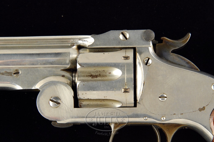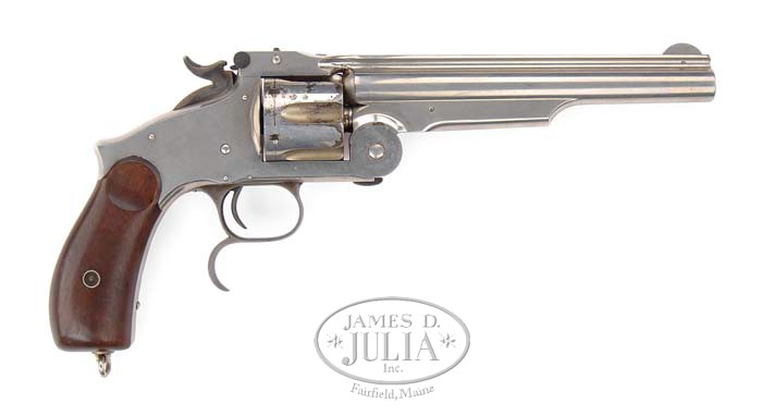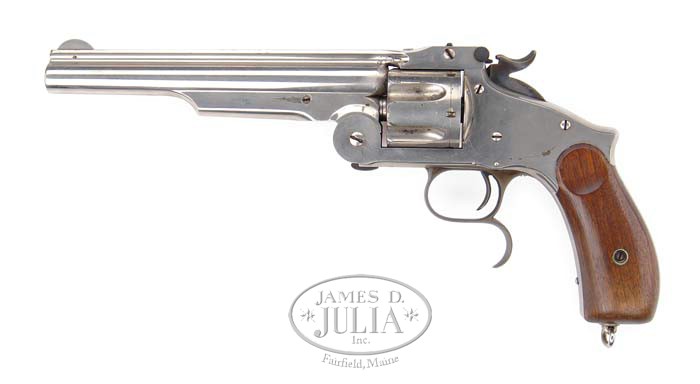 SCARCE SMITH & WESSON MODEL 3 RUSSIAN 2ND MODEL SINGLE ACTION REVOLVER. SN 35870. Cal. 44 Russian. Nickel finish with 7″ keyhole shaped bbl, pinned rnd front sight & fixed rear sight. Mounted with smooth walnut grips with a stud & lanyard ring in butt & a distinctive finger rest on bottom of trigger guard. Butt strap also has a small diamond with “SH” in middle. This is the commercial model of this famous model of Smith & Wesson revolver of which only 6,200 were made from the 85,200 total production in period 1873-78. Majority of production, 70,000, were produced for the Russian government with Cyrillic bbl markings. It was a very popular revolver on the American frontier due to its strength, reliability & ease of reloading. It was known to have been used by a variety of frontier military, law enforcement & outlaws. CONDITION: Very fine, all matching including grips. Overall retains 96-98% strong orig nickel finish on bbl & frame with cylinder retaining 88-90% orig nickel with flaked areas a dark patina. Hammer retains most of its strong bright orig case colors & trigger guard about all of its faded orig case colors. Grips are sound & retain virtually all of their orig factory finish. Mechanics are crisp, strong bright bore with sharp rifling & light to moderate pitting. 4-37230 JR330 (3,000-5,000)