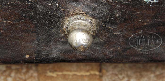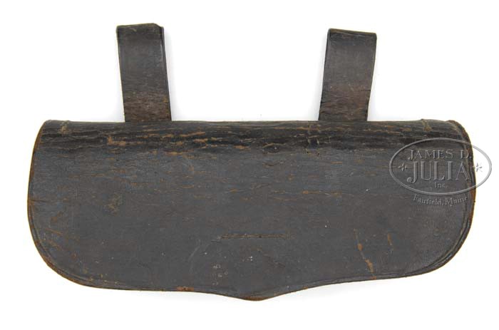 FINE CONFEDERATE CAVALRY CARTRIDGE BOX. This is a most unusual Confederate cartridge box which only measures 7″ across by 2″ deep and 3″ tall. Box closes with a lead finial and inside box the tin has 16 distinct tubes which measure about 5/8″ in diameter and about 1-3/4″ long which is about the right size for carbine ammunition. This is a most interesting box that we have not encountered before. It is very well made from reclaimed leather as can be seen in an earlier stitch design on cover. This box was most likely made for a specialty carbine that we are not aware of. This box would make a great addition to any Confederate Cavalry display. CONDITION: Box overall is sound and in very good condition. There is crazing to surfaces especially where folded. Belt loops and tab are sound & intact. 4-45076 JS19 (1,000-1,500)