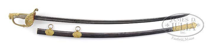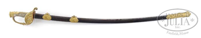 PRESENTATION CAVALRY OFFICER’S SABER OF COL. JOHN GODDARD, 1ST MAINE CAVALRY. The sword you are bidding on here is a scarce high grade French import Cavalry Officer’s saber. A similar sword is pictured on page 263 in John Thillmann’s “A Study of United States Cavalry and Artillery Sabers, 1833-1865”. This sword is presented on the back strap “Presented to Col. John Goddard by Personal Friends in Bangor”. Col. John Goddard rushed to the service of the United States after President Lincoln’s call for volunteers enlisting on Oct. 31, 1861 at Augusta, Maine. He helped raise the First Regiment Maine Cavalry that was unsurpassed by any other regiment in the service in the character of its men and the quality of its horses. In the spring of 1862, the First Maine Cavalry left their winter quarters and participated in their first severe engagement on May 23rd when they charged the enemy at Middletown, VA covering Banks’ retreat to Williamsport. The regiment also engaged the Confederate forces at Brandy Station and also at the Second Battle of Bull Run. Later on they continued their stellar career in the Union Army by fighting at Fredericksburg, Gettysburg, Mine Run and Cold Harbor among other battles. Many of the companies even took part in Kilpatricks famous daring raid. This sword features a very rare and attractive pommel being the face of a screaming Zeus, the chief mythical god of the ancient Greeks. The shark skin grip is in excellent condition as well as original wire. The blade is beautifully and patriotically etched with a stand of arms, a drum and the United States flag and floral designs. The blade is simply brilliant and the scabbard is equally attractive made of blued steel with beautiful brass mounts. The guard has an eagle perched on a shield and above the eagle seven stars surrounded by leaves. An incredible presentation sword that was undoubtedly reserved for the leader of a great fighting unit, one who was due the honor or wearing such a sword across his belt. The white etched blade is in beautiful condition retaining most of its original luster with only minor staining and is 36″ l. CONDITION: As noted above. 4-37710 JS33 (10,000-12,000)