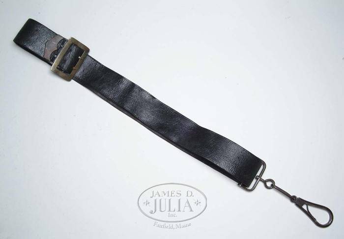RARE CONFEDERATE CIVIL WAR CAVALRY CARBINE SLING. In a letter from noted leather authority Stephen Dorsey, he states that, “the sling has been vetted by Paul Johnson, an author of a book on CW leather, and Fred Gaede, recent past editor of the Company of Military Historians Journal and an upcoming work on the American cap pouch. The three of us are “critical mass” on leather, I think, and we all agree that: 1. It is a Confederate-manufactured carbine sling and, 2. It is the only one known. There may be others, but they are, to date, unsung.” Mr. Dorsey goes on to state that while the piece was in his collection, a stamp “7 VA” could be found on the leather. It was a “flat stamp” and over a period of time, after treating the leather with oil, the mark “disappeared”. This Cavalry sling is similar in construction to standard US issued type. This, however, has a cruder carbine hook, tip, and buckle. The tip is attached with 4 integral studs. Sling buckle similar to US. CONDITION: Leather body is sound with some insect damage. Crazing and protectorate on leather. Brass tip has red coppery patina. Sling buckle has yellow brass patina. Sword hook is uncleaned with gray/brown surfaces. 4-56212 (5,000-10,000)