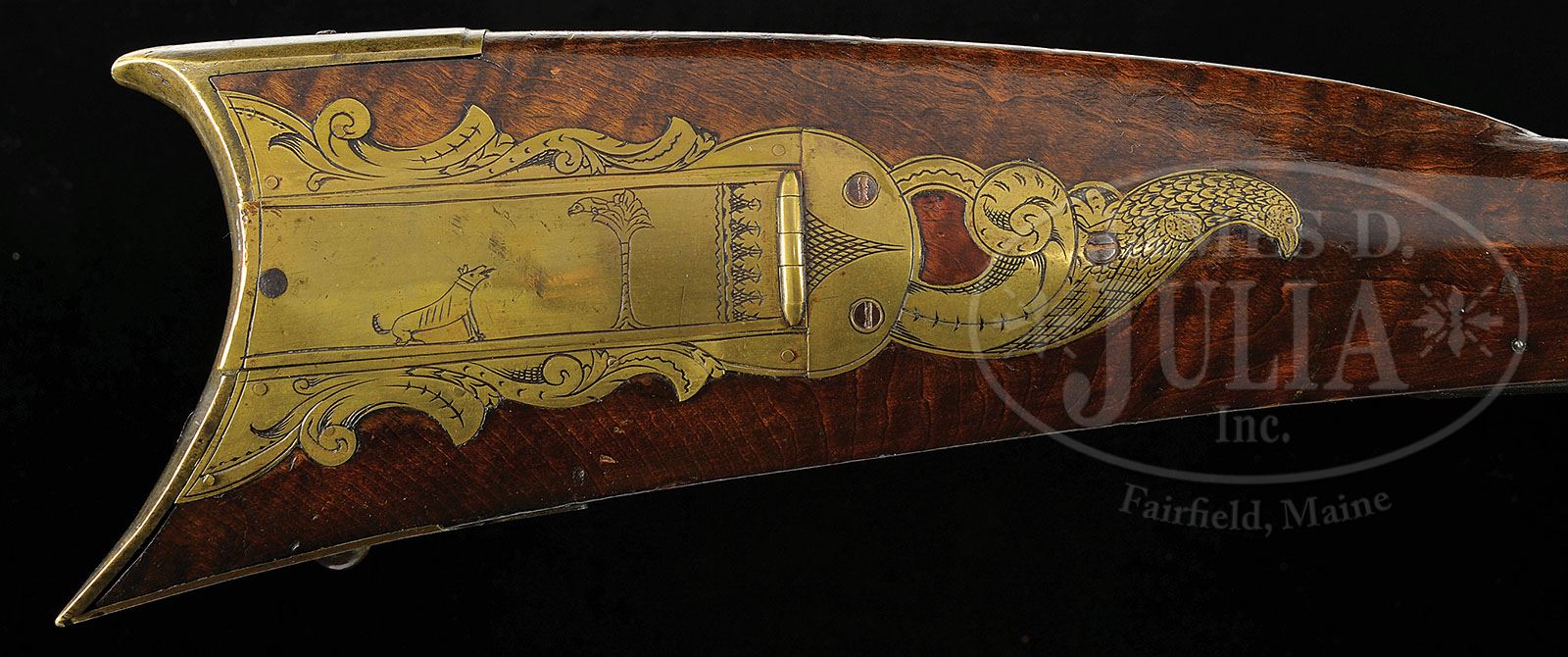 EXCEPTIONAL PETER KUNTZ FLINTLOCK ENGRAVED KENTUCKY RIFLE. SN NSN. This fine Kentucky rifle has a 43 1/2 inch full octagon smooth bore .45 caliber barrel. Although unsigned the rifle is unquestionably the product of the Lehigh County gunsmith Peter Kuntz. The original flint London Warranted lock has a roller frizzen. Peter Kuntz was the brother of Jacob Kuntz, one of eastern Pennsylvania’s most famous gunsmiths. The four piece patch box is magnificently engraved featuring an English bull mastiff barking at a bird perched atop a tree. The finial design depicts a fully plumed eagle resting on a Nautilus shell along with one piercing where wood is exposed. The brass cheek piece inlay is in the form of a rising sun with a lunette shape above it forming a natural piercing. The engraving on the rifles patch box, cheek inlay, thumb piece inlay, toe plate and side plate approach the quality of engraving of his famous brother whose work is on display in New York’s Metropolitan Museum of Art. This is an exceptional quality early 19th century rifle that demonstrates the high quality of skill exhibited by eastern Pennsylvania’s Kuntz family of gunsmiths. This rifle was awarded the silver medal for “Best Non-Carved Rifle” at the 2003 Kentucky Rifle Show. The medal accompanies the rifle. Includes: Silver KRA Award bottle tag CONDITION: This rifle is practically in work bench condition showing only minor handling marks from nearly two centuries of careful handling. 4-49674 (18,000-35,000)