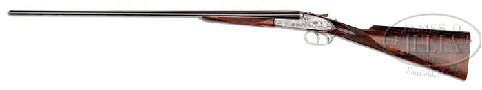 *EXQUISITE .410 HOLLOWAY & NAUGHTON BEESLEY PATENT SELF-OPENING SIDELOCK EJECTOR GAME GUN ENGRAVED BY G. PEDRETTI WITH CASE. SN 410-73. Cal. .410. 3″ Chambers. This beautifully made and appointed wand has 28″ chopper lump bbls, engraved “Holloway & Naughton England” on narrow game rib. Bbl flats are stamped with 1988 London nitro proofs. SNs are on bottoms of bbls. Delicate, scaled down, Beesley patent, round bodied action is coin finished. It features automatic safety (SAFE inlaid in gold), bushed strikers, gold line tumbler end cocking indicators, and Beesley’s patent spring cocking/ self-opening action of Purdey fame. This beautifully filed action is engraved with exceptional small tight scroll. Bottom of action and sidelocks are Bulino engraved in realistic depictions of bobwhite quail being hunted by English pointer in open southwestern terrain with cactus in foreground and scrub hedgerows in background. Pointer is on point with trio of quail in foreground on left lockplate. Covey is rising on bottom of action, and bird is being retrieved on right lockplate. These scenes are truly exceptional, and extend to edges of lockplates in Kell style. Noted master engraver, Giancarlo Pedretti’s signature appears on trigger plate and at rear of right lockplate. Stunning intricately marbled and nicely fiddle figured Circassian walnut straight grip buttstock measures 14-7/8″ over checkered wood butt, and features standard point pattern checkering with mullered borders and Purdey style drop points. Matching splinter ejector forend has Anson release. Bore diameter at muzzles: left -.393, right -.398. Wall thickness: left -.43, right -.041. Drop at heel: 2″, drop at comb: 1-11/32″. Weight: 5 lbs. 7 oz, LOP 14-7/8″. Makers toe under leather case with stitched leather corners is lined with scarlet cloth and has gold embossed black leather makers label, and contains 3 ivoroid handled H & N marked turnscrews, round nickel-plated oil bottle, snap caps, and very fine brass and ebony 2-pc cleaning rod with mop, brush, and jag, and the key. CONDITION: Excellent, near new, showing only a few scattered minor marks in wood. Bores are excellent, Ejectors are somewhat out of time. Case leather is excellent, with a few marks and scuffs. Interior cloth and accessories are excellent, near new. 4-46118 MGM81 (80,000-120,000)