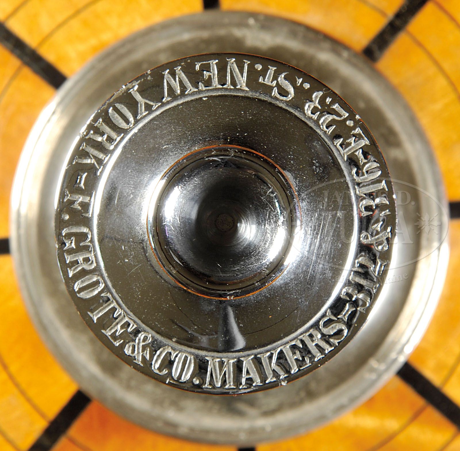 FINE NEW YORK F. GROTE & CO. ROULETTE TABLE. First 3rd 20th century. The table with original baize lined gaming surface, the wheel head end with detachable tray, mounted on a double turned pedestal base raised on claw feet joined by a baluster turned stretcher. The 31″ rosewood and maple wheel with silvered central mounting post cast “F. GROTE & CO. MAKERS-312 & 316-E. 23 ST. NEW YORK”. The mounting plate with the stamped number 178. The wheel with original fitted shipping crate. This item is accompanied by a quantity of period $1.00 and $5.00 chips. SIZE: 31-3/4″ h x 8′ l x 43-1/4″ w. CONDITION: Wheel is in very good original condition. Baize surfaces sound but with wear and overall fading. Some wear and losses to baise side edge at player’s end, also with small holes. Base is original and very good. Dealer’s chip drawer absent. 9-25700 (6,000-7,000)